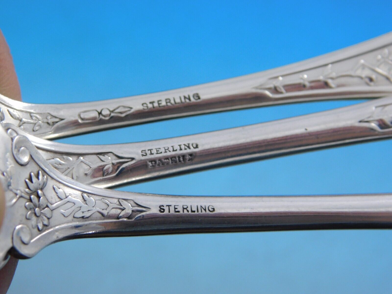 Excellent condition, most pieces with no monograms, some pieces with varying monograms on the reverse. Some handles in this pattern bend down at the tip and some curve up. This set will be lightly polished and sealed in individual plastic sleeves prior to shipping. Fabulous!
