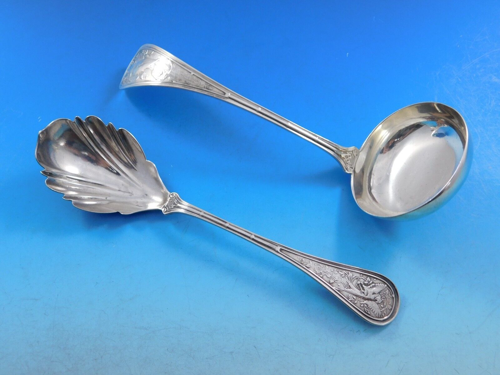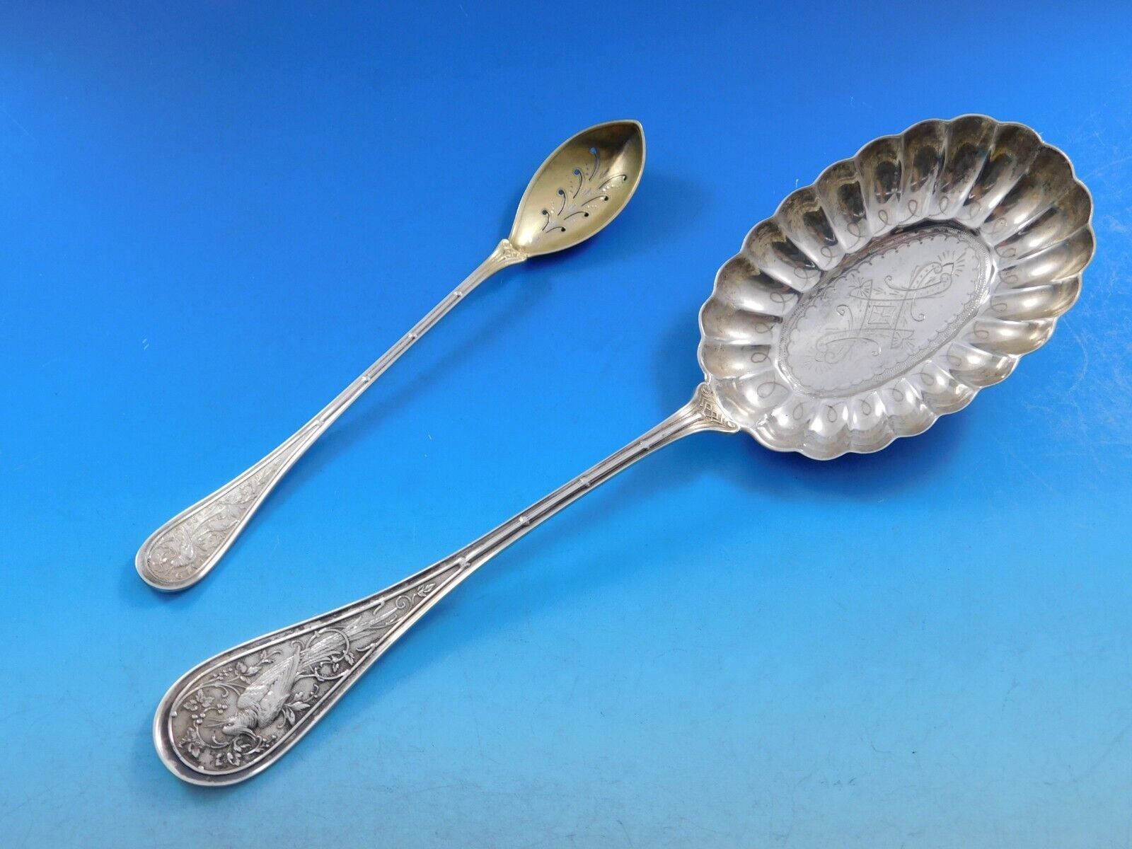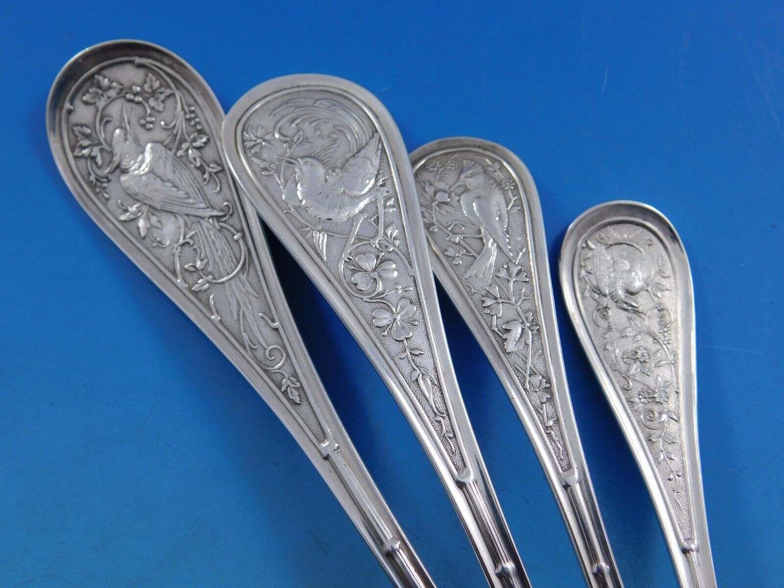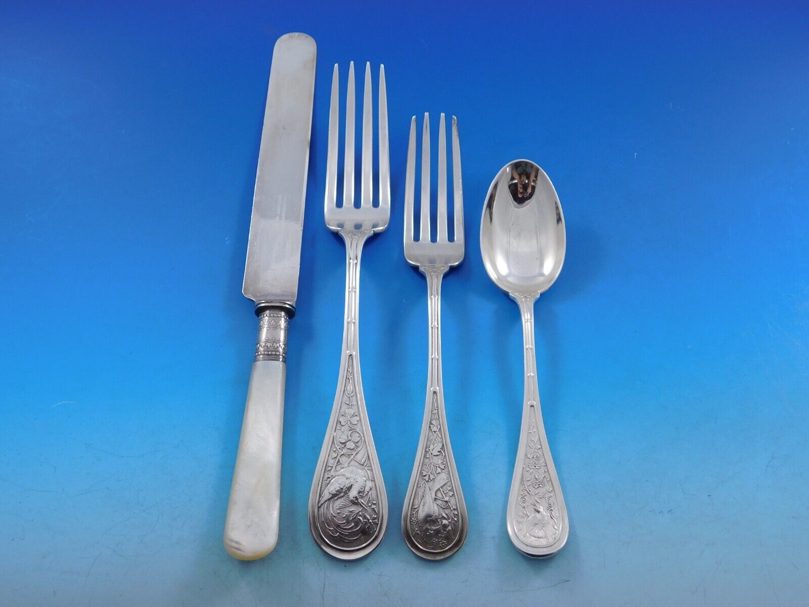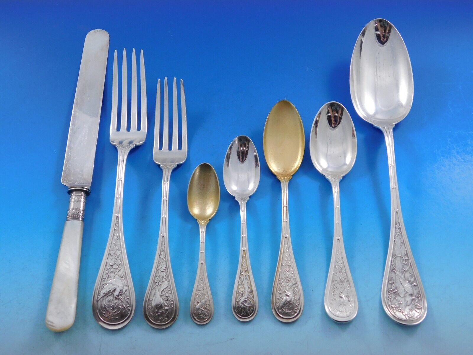 Rare Bird / Audubon by Wendt, circa 1872, sterling silver Flatware set - 72 pieces. This multi-motif Japonesque pattern has a bamboo design running up the handle, with a swooping or plunging bird amidst assorted flora. This set includes: