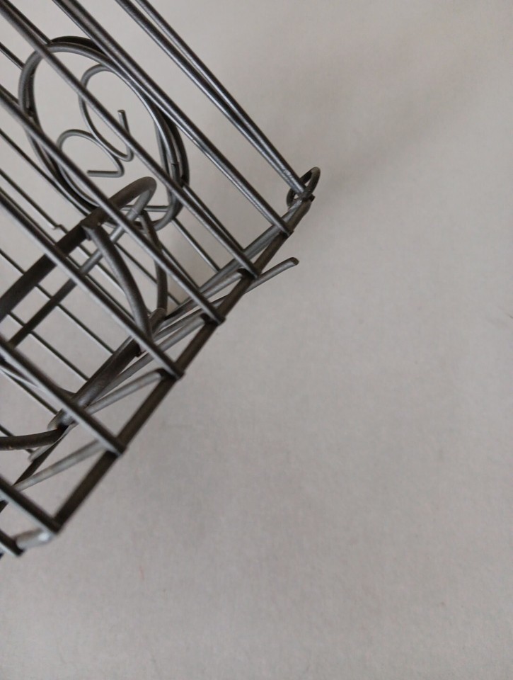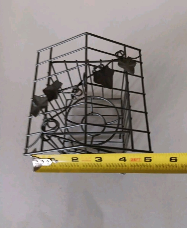 This candle holder is a charming addition to any farmhouse or country-style decor, featuring a unique birdhouse shape crafted from metal wire. The rustic silver color adds a touch of vintage elegance, making it a functional and decorative piece for any home. Its country style design adds character and warmth to any space, making it a stylish and practical choice for holding candles or displaying small decorations. Normal wear.