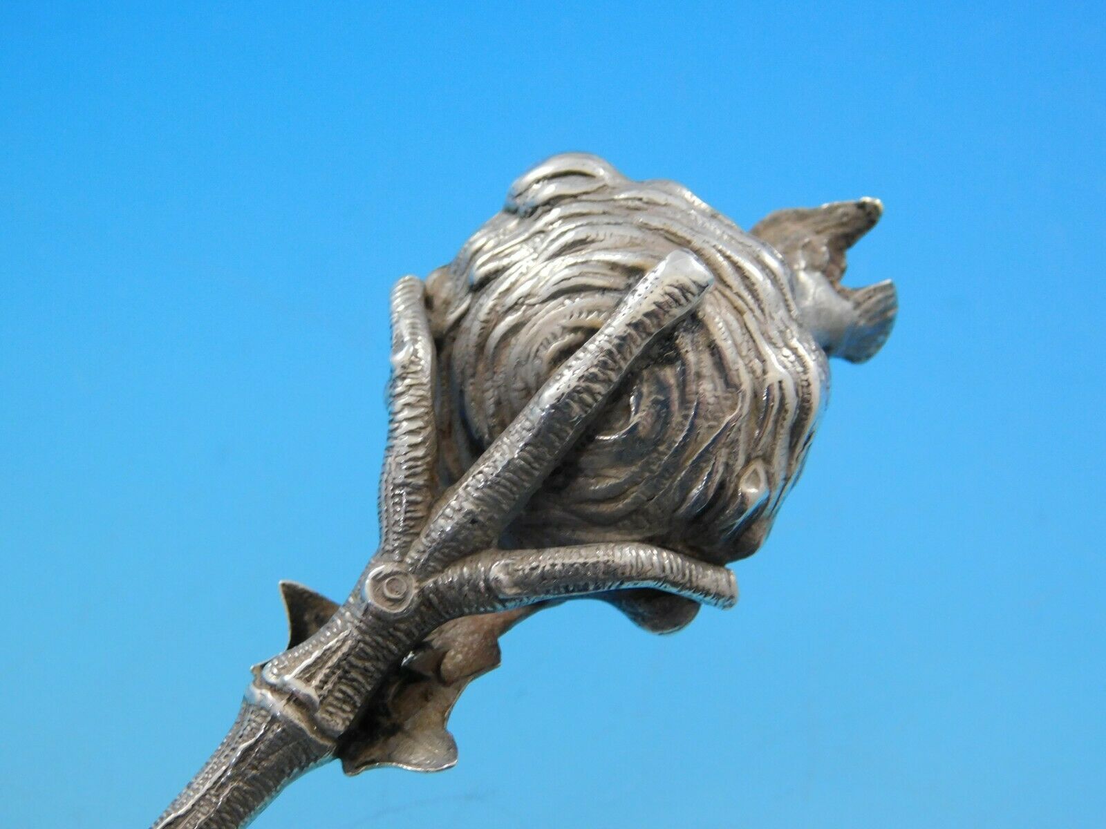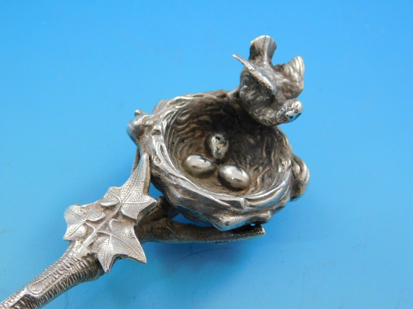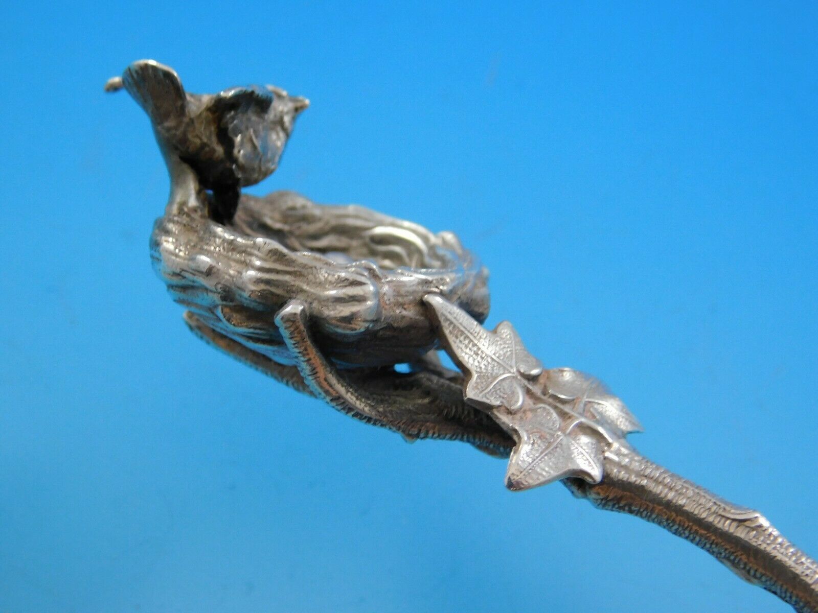 Beautiful sterling silver Berry Spoon with Stippled Bowl 9" in the pattern Birds Nest by Gorham. This piece features a three dimensional birds nest with mother bird and eggs. At the base of the handle there are leaves above the bowl.