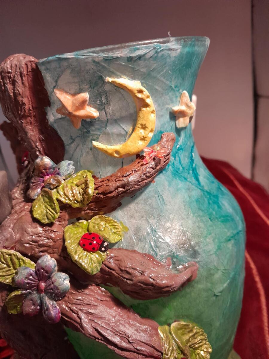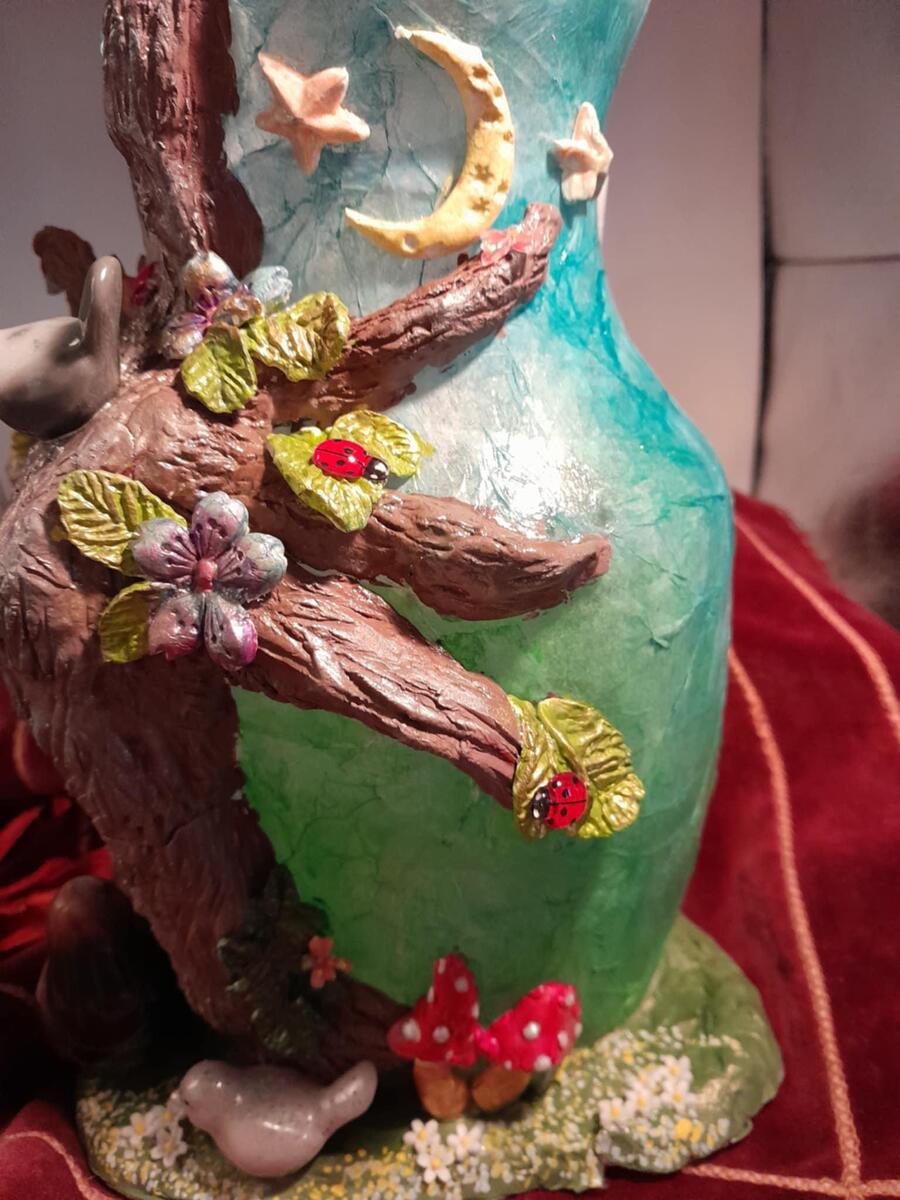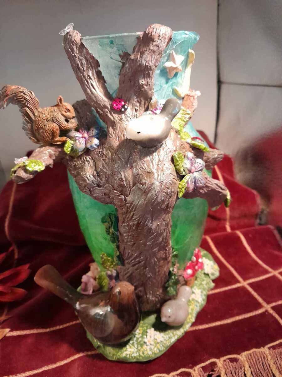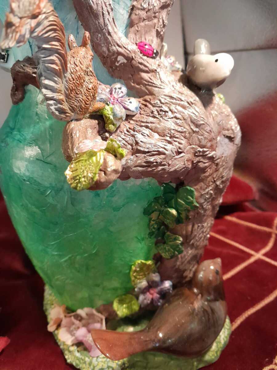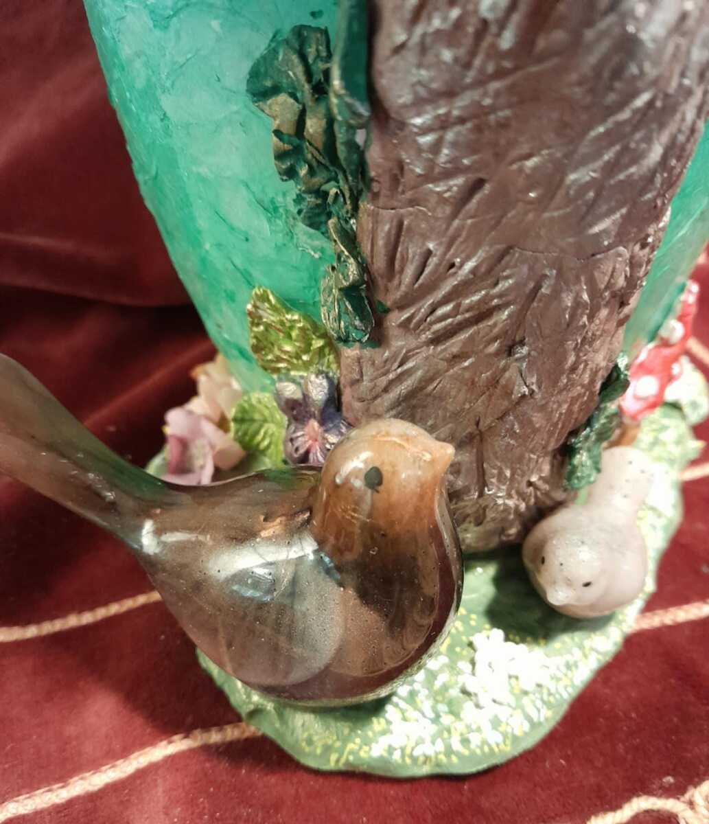 In the Big Woods there are gorgeous trees. In this tree lives a bird family. They are out of the nest today and enjoying their neighbor, the Squirrel and various Ladybugs. This mixed media work of love is multi use. You can use it as a nightlight. I've including 1 strand of twinkle lights, but you can add more substantial lighting. Or if can be used as a floral vase. Just don't ever soak or get the outside of the vase wet.