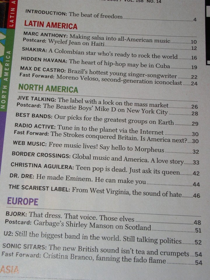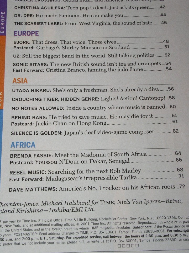 This is the Fall 2001 issue of "Time" magazine Special Issue on Global music. Cover pics of Bjork, Brenda Fassie, Marc Anthony, Utada Hikaru, Max de Castro, Shakira. Inside short articles on Bjork, Shakira and Dave Matthews. A terrific item for the fan or collector.