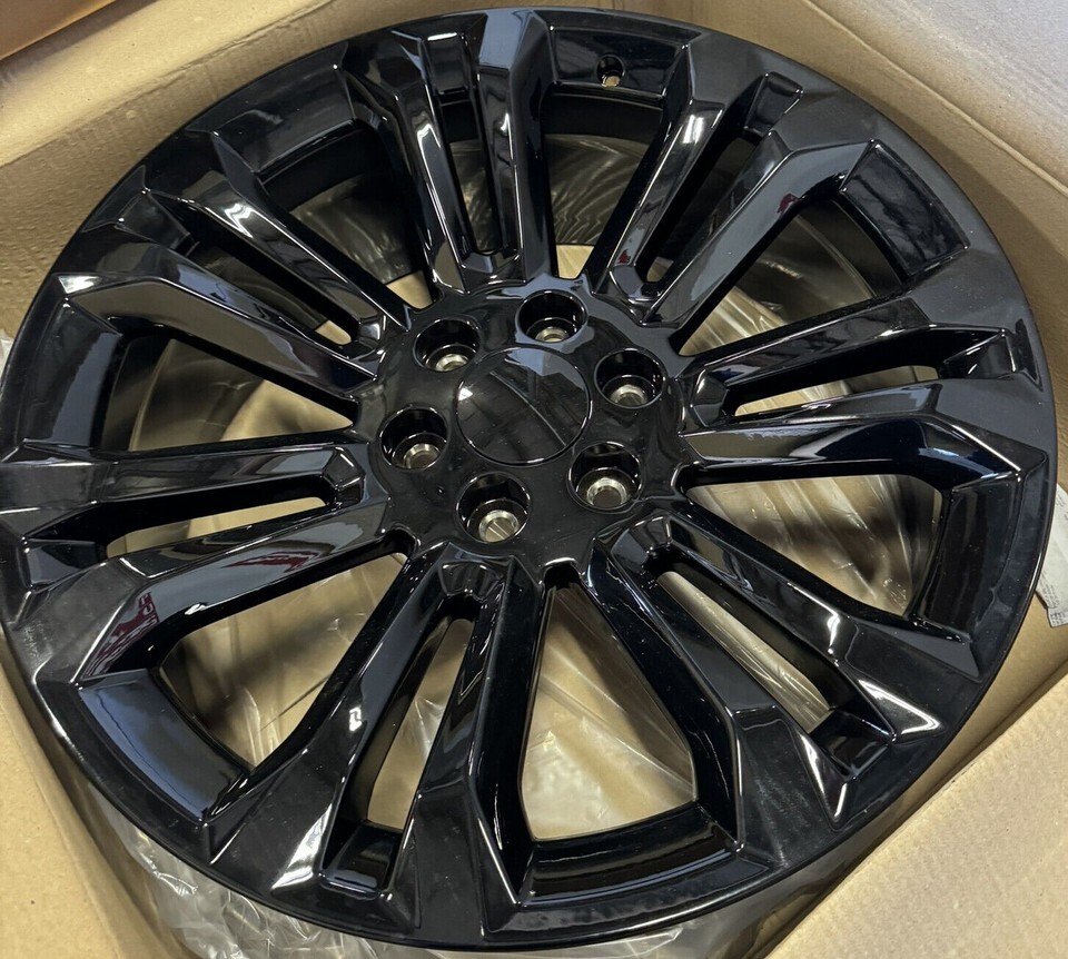 New Set Of Four GM Style Replica 22" Gloss Black Seven Split Spoke Wheels With New Blackhawk Ridgecrawler R/T 285/45R22 Tires.
