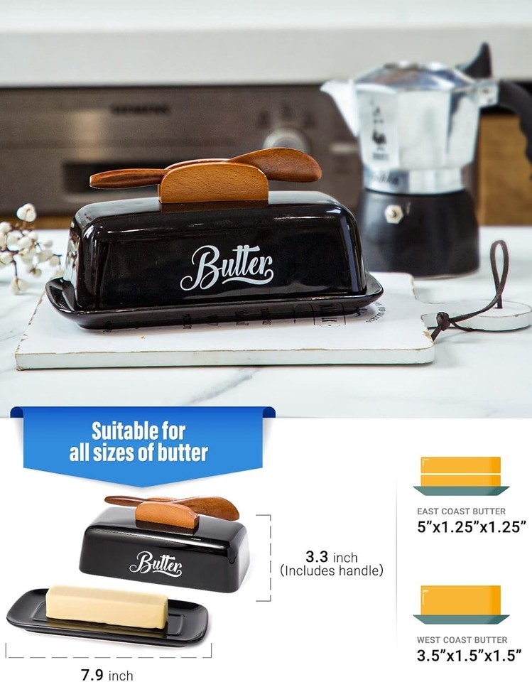 ?BUTTER DISH WITH LID AND KNIFE?: The set includes a lid with a handle and a butter knife. The lid fits perfectly into the base, keeping the butter perfectly sealed, maintaining its freshness for longer. You can also use our included butter knife to cut butter or spread, making your life much easier.