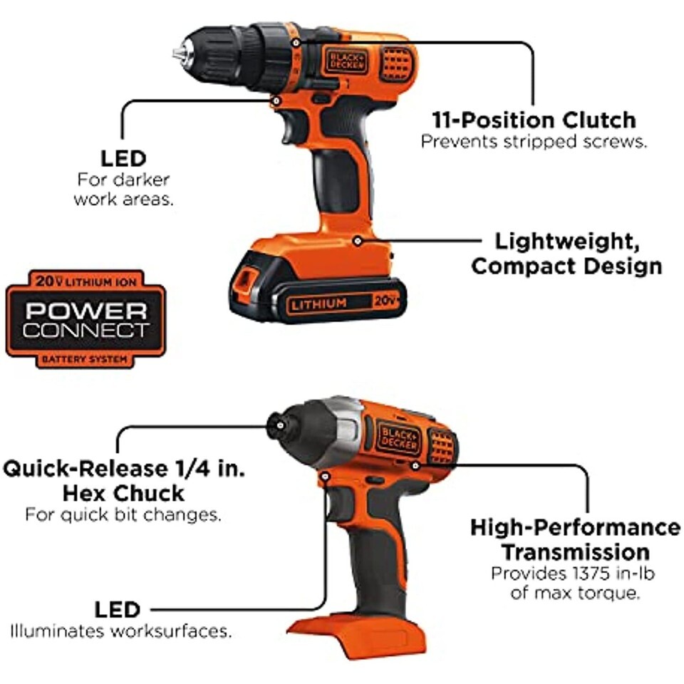 With BLACK+DECKER's 20V MAX* 3/8 in. cordless drill/driver and impact driver combo kit, you?ll be able to take on around-the-house projects with confidence. The lightweight, compact drill is sure to be the tool you reach for again and again, thanks to features like an 11-position clutch that helps prevent stripping or overdriving screws. A variable-speed trigger lets you progress at a comfortable pace for enhanced control. It's ideal for screwdriving tasks and for drilling into wood, metal, and plastic?even in tight spaces. And when the job calls for a cordless impact driver, this one won't let you down. The quick-release 1/4 in. hex chuck lets you change bits quickly, so you can get back to work. Both the portable drill and the impact driver are even equipped with a built-in LED work light, and both use the powerful 20V MAX* POWERCONNECT lithium ion battery that's compatible with the whole suite of POWERCONNECT tools. *Maximum initial battery voltage (measured without a workload) is 20 volts. Nominal voltage is 18 volts.