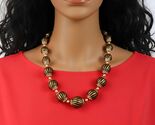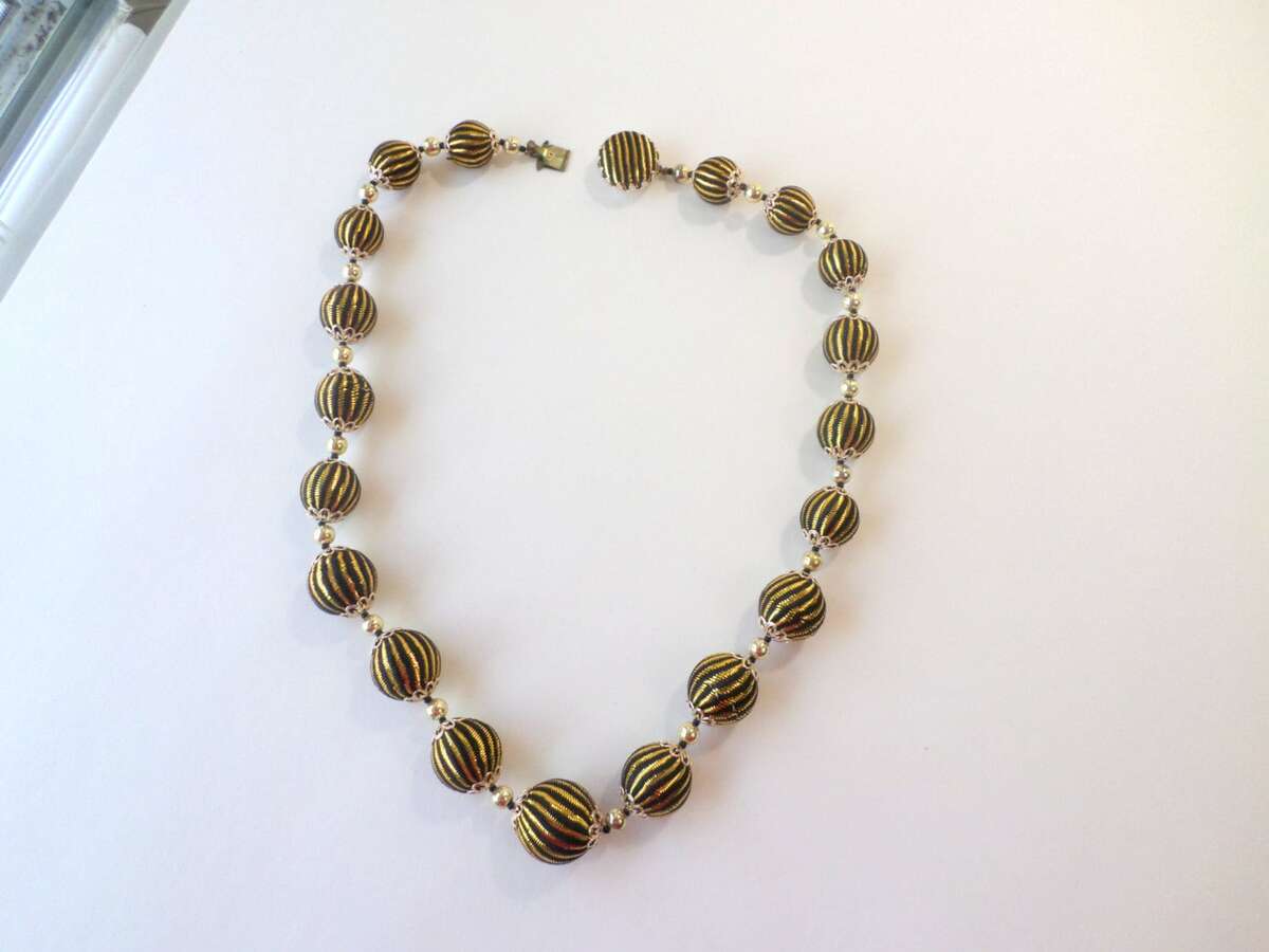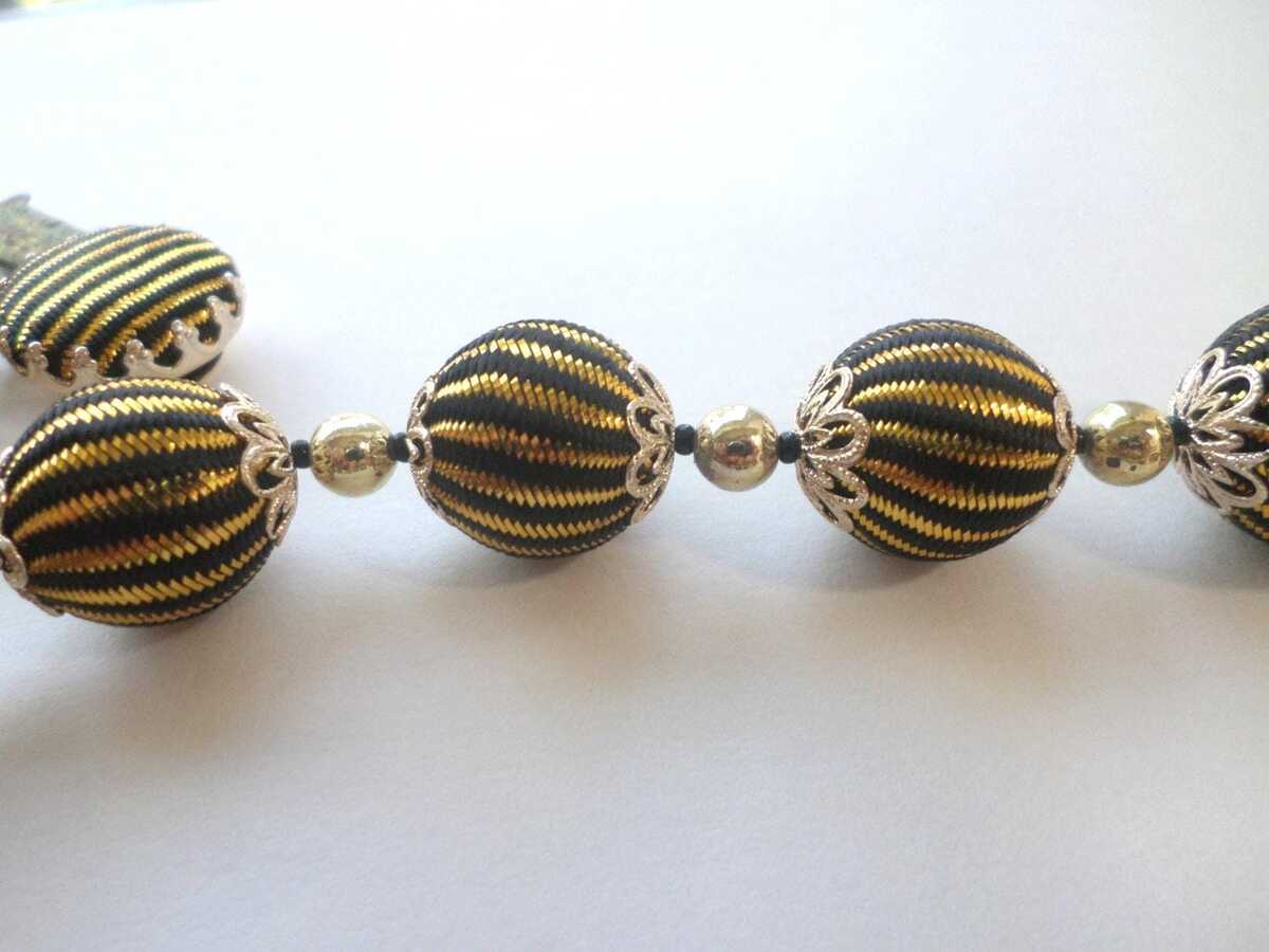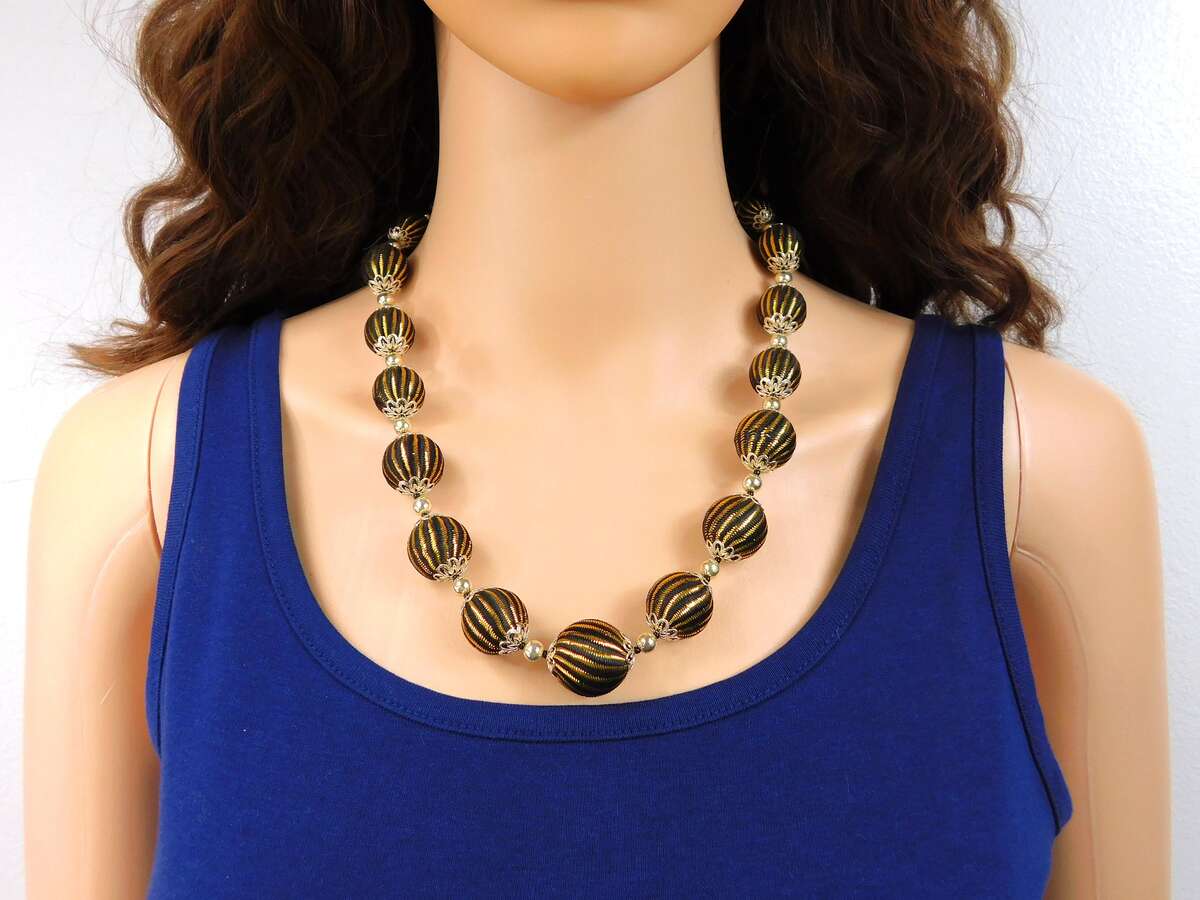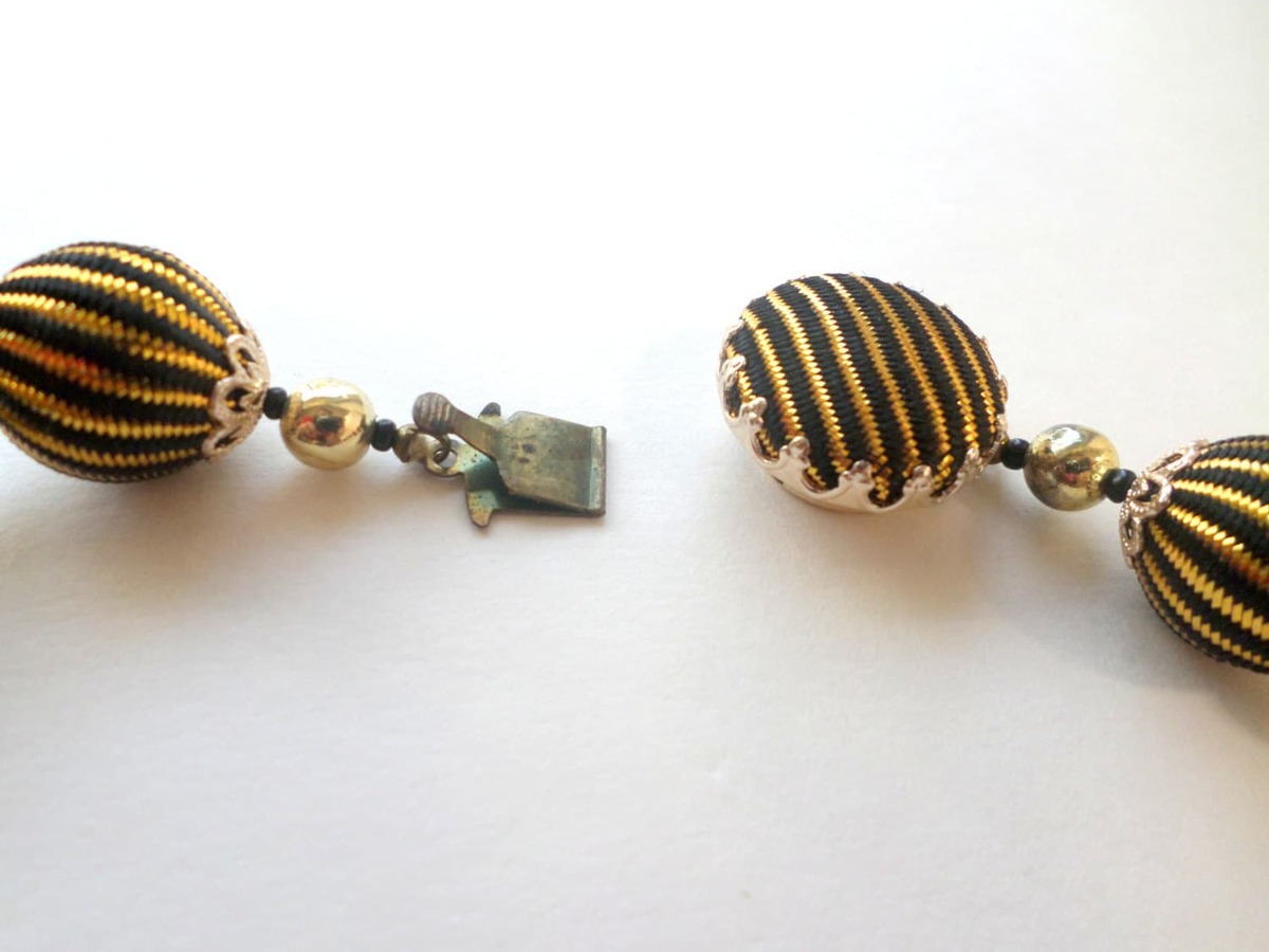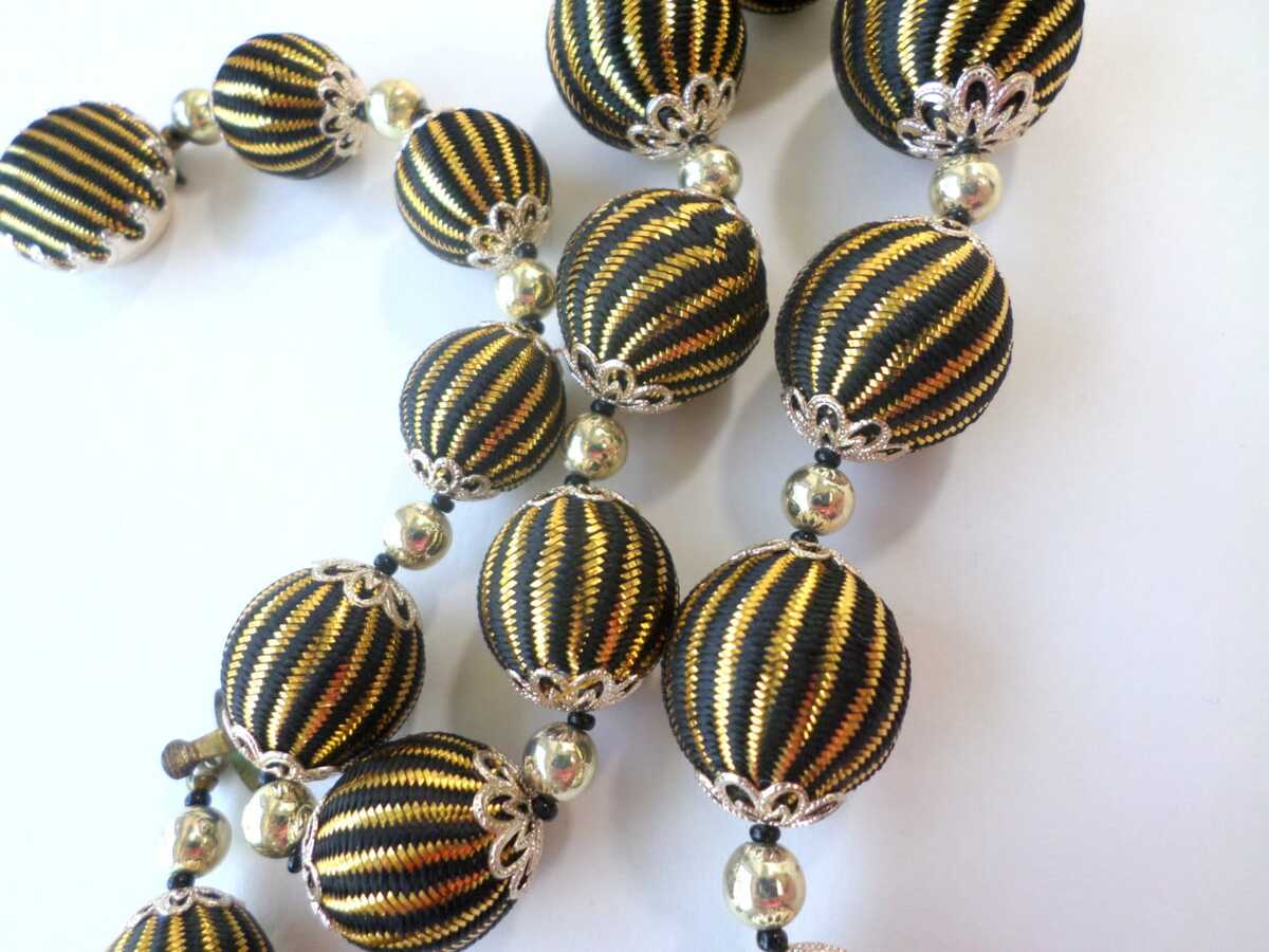 ?Style/Features: Make an entrance wit this signed 1950s Japan fabric covered beaded necklace. A striking piece of vintage Japan jewelry it features silk fabric in black with gold stripes over beads with a matching hidden covered clasp. This statement piece is remarkably lightweight giving great movement to the wrapped beads making the gold color shimmer for all day wear. The chunky bead necklace design is quintessentially mid century style offering a bold retro statement look making updo's effortless with the matching hidden clasp. Whether worn with a contrasting color or with black making the gold threads pop the tessellated beads guarantee to receive compliments.