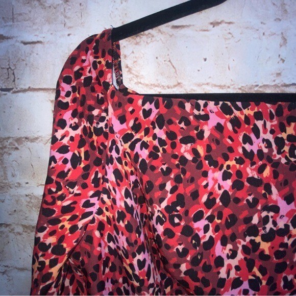 Allover leopard print, Concealed back zip with hook-and-eye closure. Lined, Self: 87% polyamide, 13% elastane; lining: 96% polyamide, 4% elastane. Red pink black