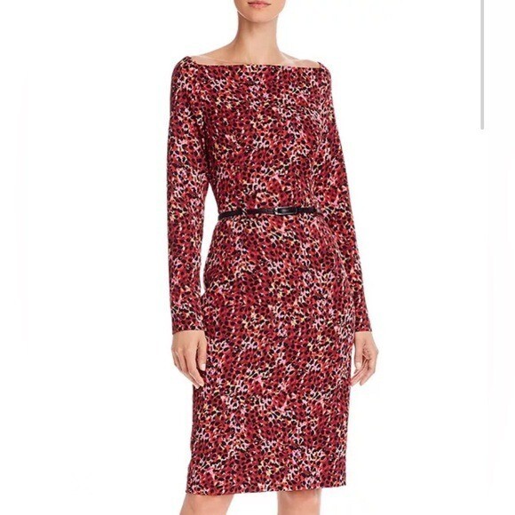Black Halo Parker Leopard Print Sheath Dress Size 10 - Boatneck, Long sleeves, strapless-bra-friendly, Detachable belt with belt loops at the waist, Sheath silhouette