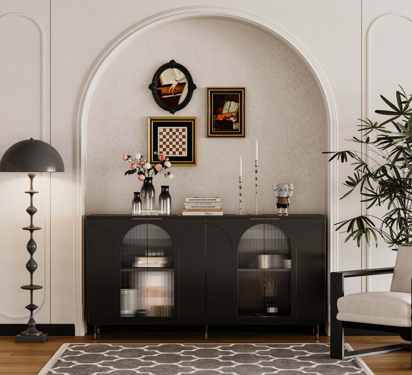 This cabinet is designed with minimalist style along with a stable structure to make a unique statement, which provides powerful practicality rather than a household adornment. With plenty of space to offer, utilize the casual four-door cabinet featuring two-tier storage to minimize clutter while keeping select essentials within easy reach, or display your favorite decor on the spacious upper counter.