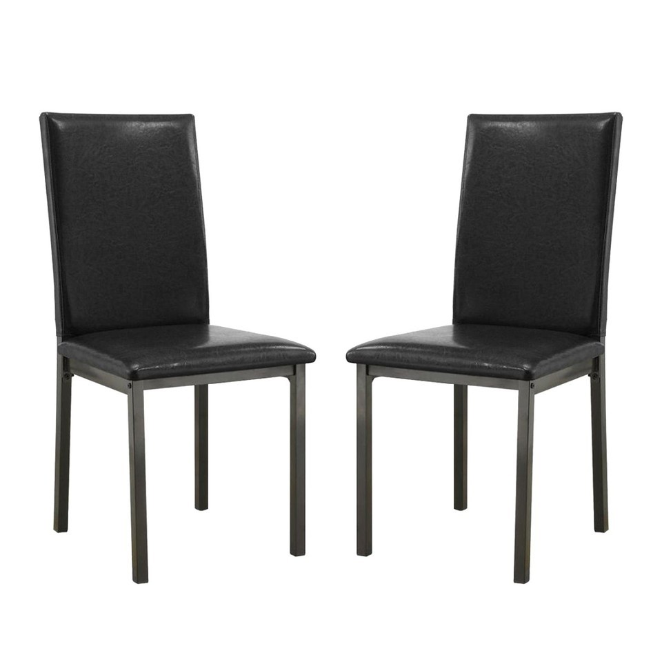 Elegant simplicity. The understated silhouette of this side chair adds a welcome accent to a transitional living area. Minimalist styling borrows from a mid-century theme. Upholstered in black leatherette, its seat and back cover blend perfectly with a black finish frame. Call attention to a casual dining table with this black dining chair.