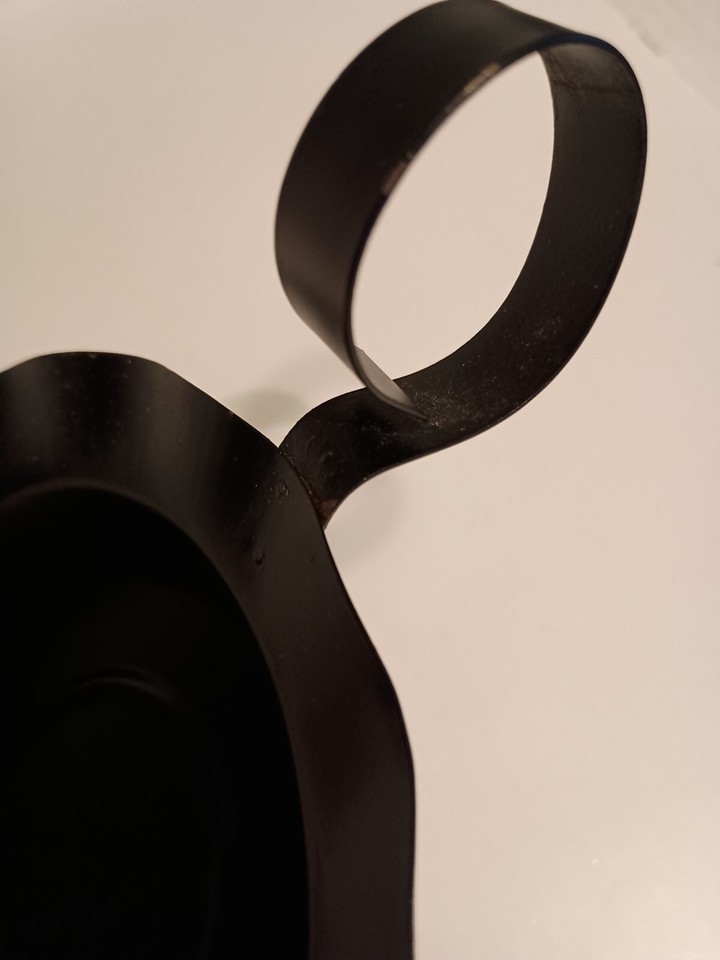 This small round black metal candle holder is designed in a primitive country farmhouse style, perfect for creating a cozy ambiance in any space. Made of tin, it features a decorative metal base and a handle for easy transport. The matte finish adds to its rustic charm, making it suitable for holding votive candles, pillar candles, or tea lights. Its free-standing design allows for versatile placement in any room of the home. Normal wear.