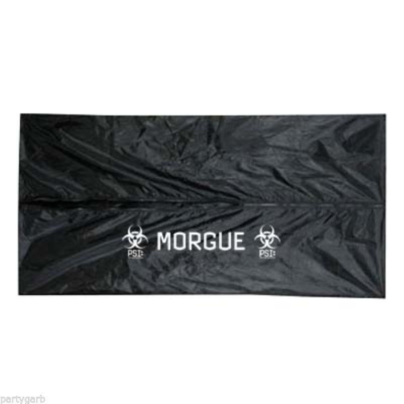 Black body bag for the dead has the words "Morgue" Biohazard sign, "PSI: party scene investigation" printed on one side. Has a zipper in center. Stuff with newspaper, mannequin, doll or fake body parts. Creepy looking. This would be a great addtion to your haunted house, chamber, laboratory or morgue, mystery murder dinner party, prank, etc. Size: Approx. 3 feet wide by 6 feet long. Made of a Nylon like looking material. The print on these bags are different color shades some darker some lighter.