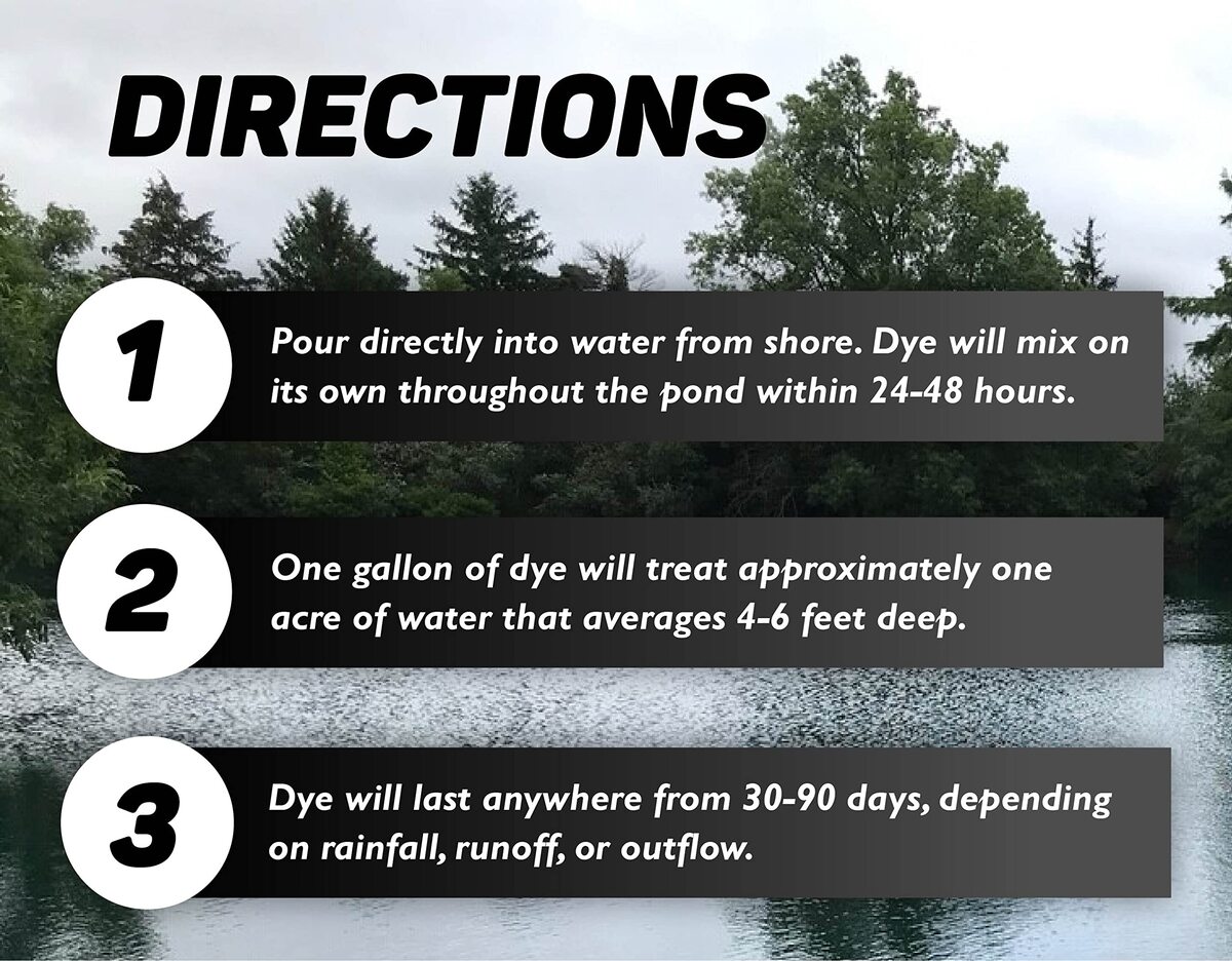 Directions: 1. Remove the product from its packaging. 2. Determine the size of your pond and the desired color intensity. 3. Mix the dye according to the sizing guidelines (e.g., 1 gallon treats 1 surface pond acre, and 4-6 ft. deep). 4. Evenly distribute the mixed dye in your pond. 5. Monitor the water color and adjust the amount of dye as needed to maintain the desired color and clarity for up to 30 days.