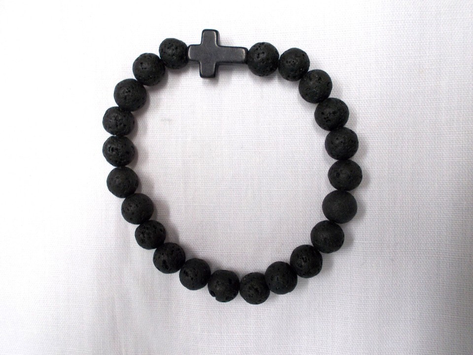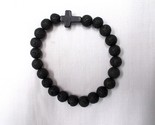 BLACK ROUND LAVA BEADS & HOWLITE CROSS BEADED STRETCH BRACELET UNISEX 6 - 7"