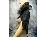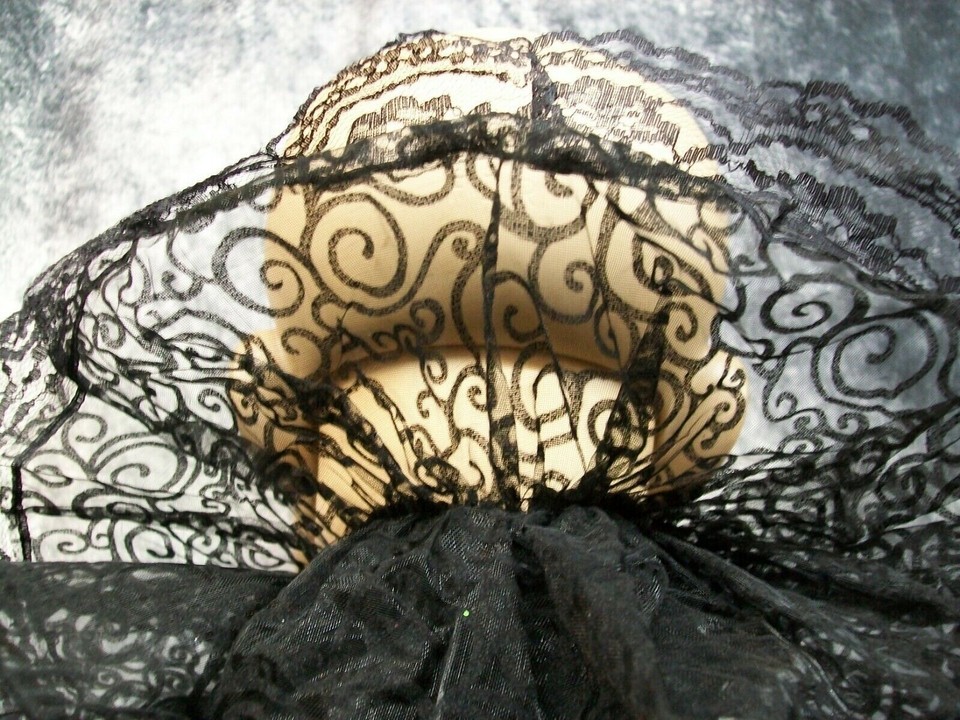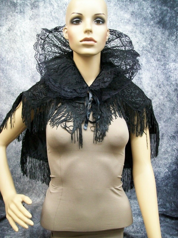 Black Shawl with Lace around the collar and fringe along the outer edges. Jagged cut look. Black satiny material with a sheer overlay that has a swirl design. 100% Polyester. Can be worn several ways. I believe it is meant to wear with the fringe starting at the shoulder / armpit area so it just kinda hangs off the back. If worn this way the lace collar won't stand up around the neck. Ribbon ties in the front. Can be tied tighter more like a collar. If worn tied tighter, there will be excess fabric bunched up behind the neck. Some longer fringe and threads here and there may need trimmed. No age specs but most costume items for ages 14 and up. One Size Fits Most Adults. Will look small on larger frames.