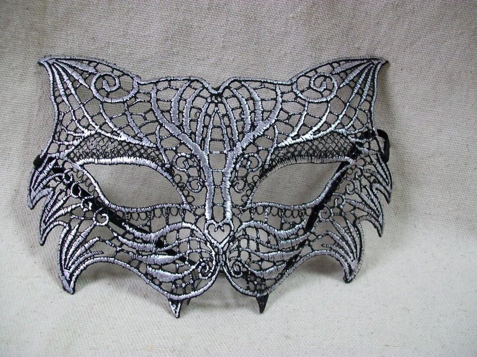 Filigree Stiff Lace like Venetian or Masquerade Costume eye mask. Has elastic strap. Covers only eye area of the face. This type of mask is great for parties because it is easy to wear while talking, eating, or drinking. One Size Fits Most. No Tags. No age specs, most costume items are for ages 14 and up.