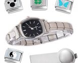 - Black Squircle Italian Charm Watch Bracelet with Lines Plus Tool & Enamel Charms