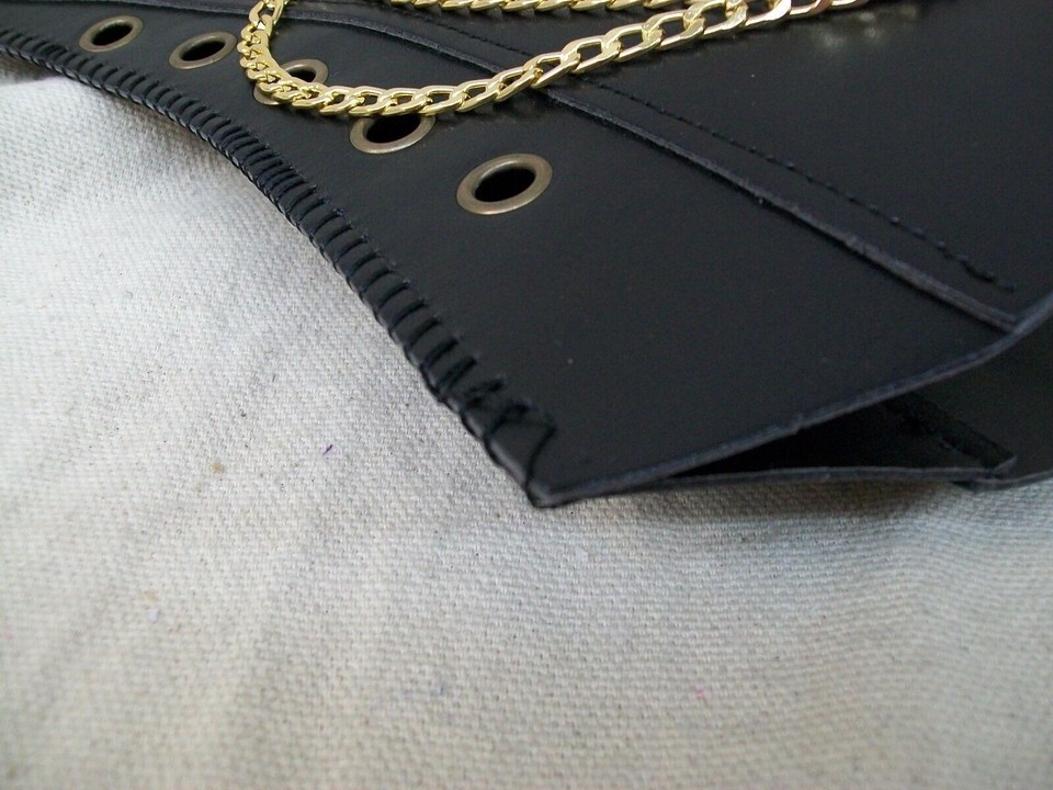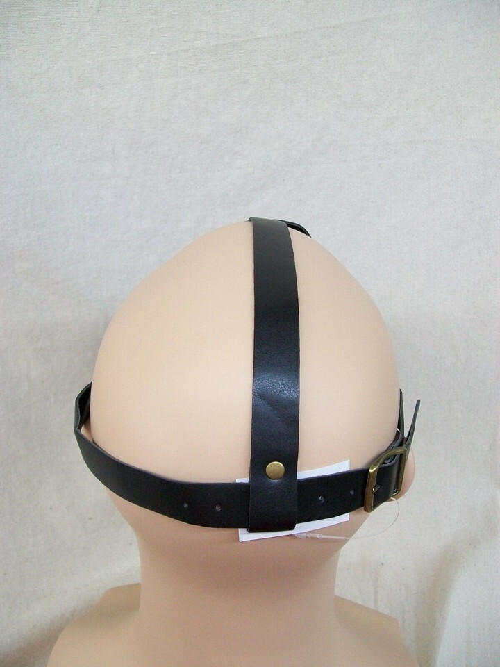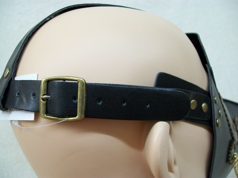 Plague Doctor Costume Mask with gold Chains and Cog Accents. Black Faux Leather Look. Has Black plastic tinted lens in eye holes. Center of beak on the underneath has hole for ventilation. May need to add some lightweight stuffing in the beak to maintain shape. Has an adjustable head strap with buckle in the back. DOES NOT INCLUDE MANNEQUIN.