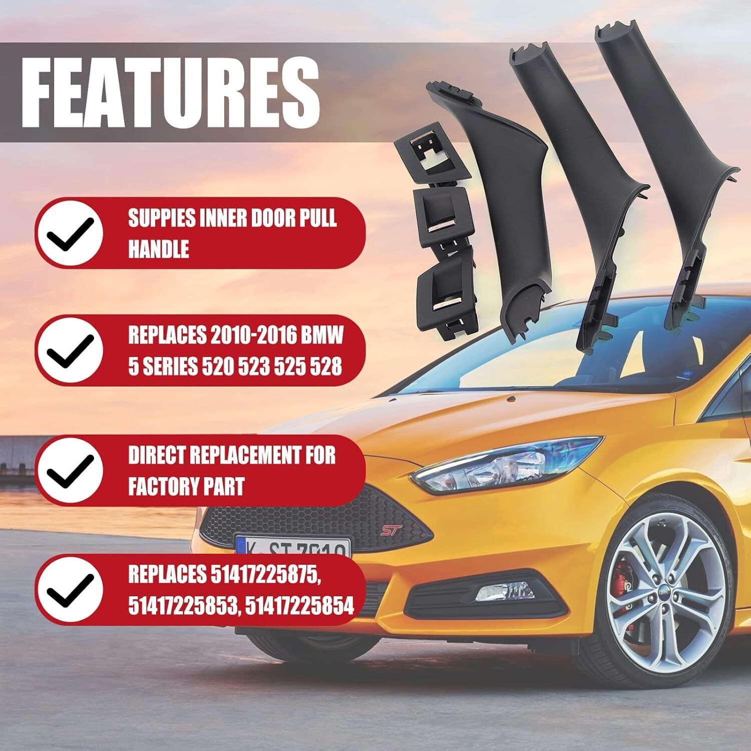 INNER DOOR PULL HANDLE - TOP quality Door Pull Handle Cover Trim made by ABS+PC Materials, which is smoother and solid than original one upgrade design: preventing the door handle from stain, scratch and deglue, trouble free from the original defects COMPATIBLE WITH FOLLOWING VEHICLES - Door Handle fit for 2010 2011 2012 2013 2014 2015 2016 BMW 5 Seriess 520 523 525 528 530 535 F10 F11 F18, please check the fitment in the product description below REPLACE PART NUMBERS - 51417225875(Front Left), 51417225853(Left), 51417225854 (Right), 51417225892, 51427234428, 51427234427 Please check the part numbers whether it suits your vehicle before purchasing. OEM DESIGN DIRECT FIT - Quality materials advanced technology used, meets or exceeds OEM standards. Even though this is not a genuine BMW Door Handle, but it works even better and lasts longer. Save yourself times and money by replacing Door Handle on your BMW 5 Seriess yourself. BUY WITH CONFIDENCE - All products have been 100% tested before delivery, If you have any problem with our Door Handle for BMW 5 Series, feel free to contact us, we will sort things out together.