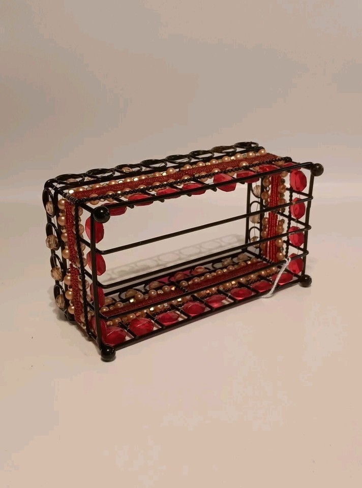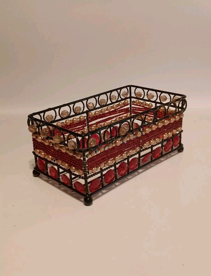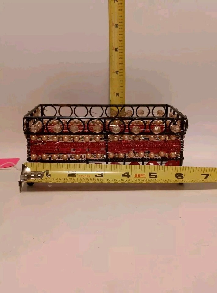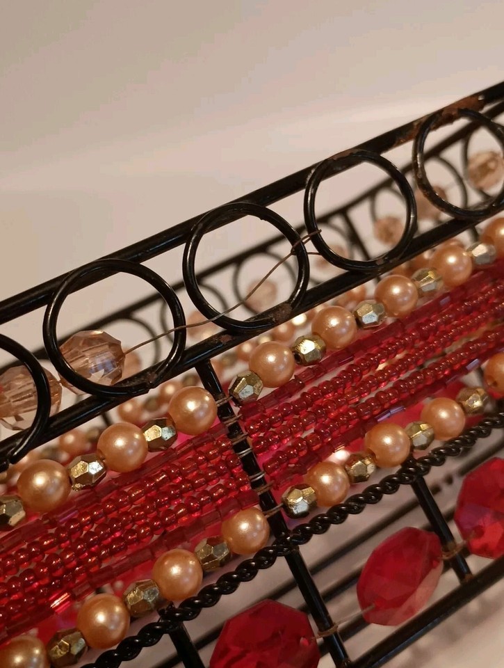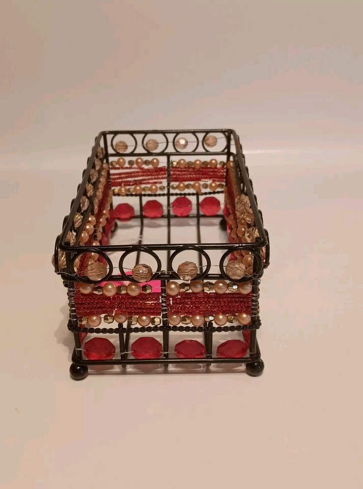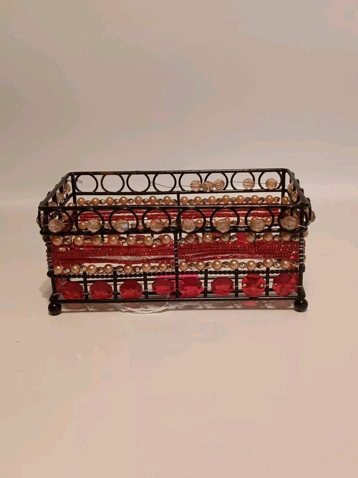 - Black Wire Beaded Bathroom Caddy Rectangle Shaped Red, Pinkish Gold Tone Beads