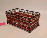Add a touch of vintage charm to your bathroom with this black wire beaded caddy. The rectangular shaped caddy features red color beads and pinkish gold tone beads that give it a unique and decorative look. It is made of metal and has a retro finish that makes it perfect for all occasions. This small caddy measures approximately 6 inches in length, 3 inches in width, and 2.5 inches in height. It is free-standing and has a footed base that adds to its stability. The caddy is perfect for storing bathroom essentials and is suitable for adults. Get your hands on this vintage/retro style caddy today and add a touch of elegance to your bathroom decor. This is a Pre-owned item with normal wear. NOTE SOME MISSING BEADS, SEE PICTURES.