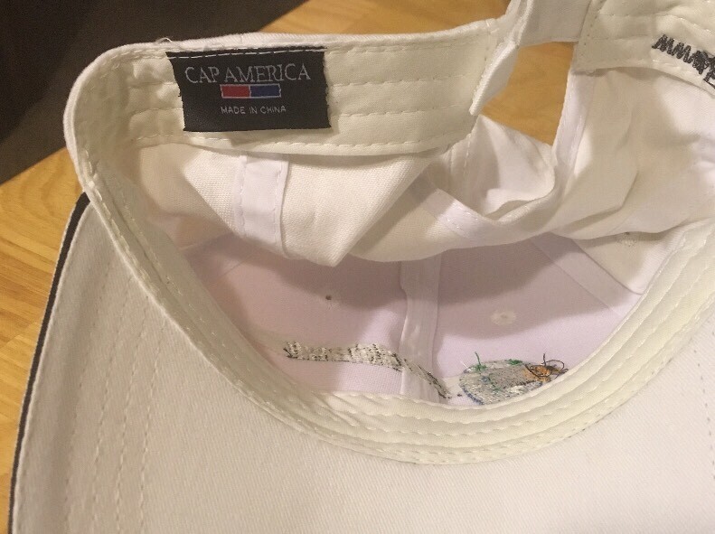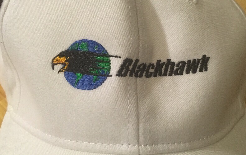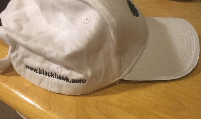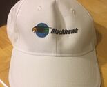 White cotton baseball type hat advertising Blackhawk Aero. Adjustable strap, good condition. Made by Cap America.