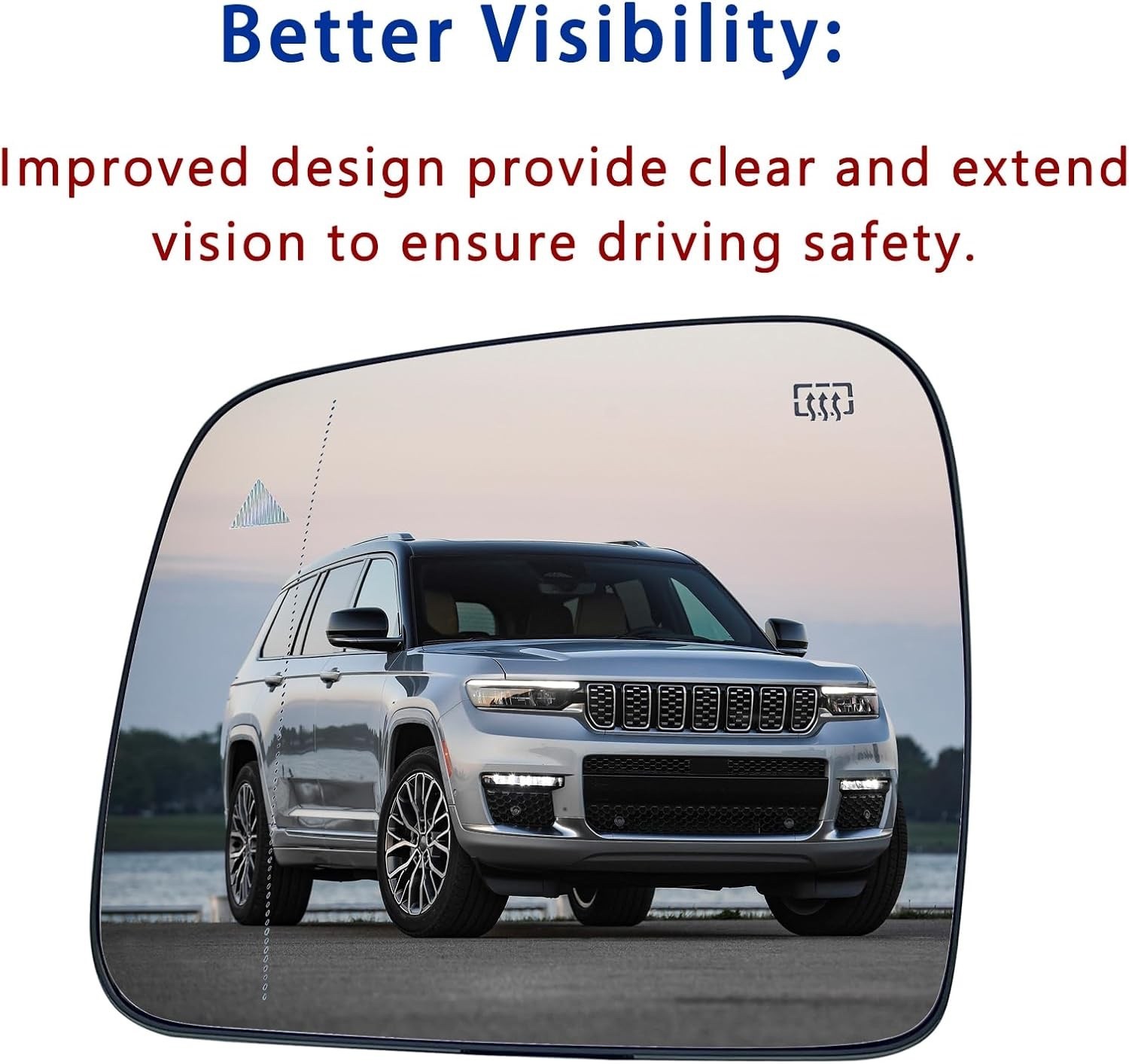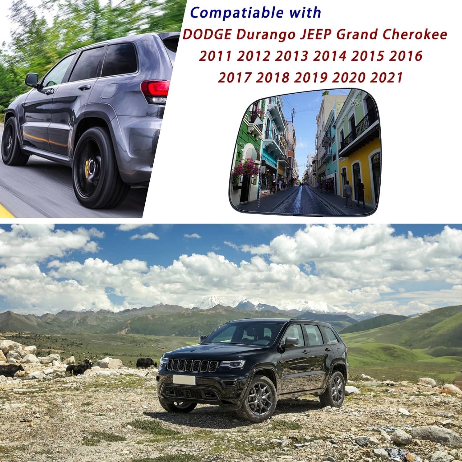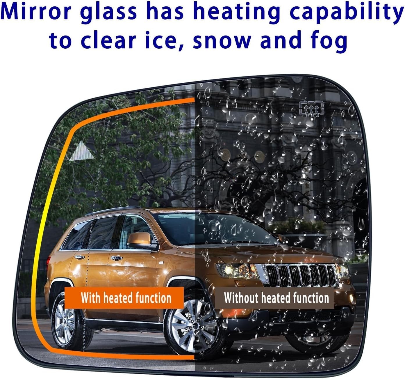 ?Heating Function?: The side mirror for DODGE Durango JEEP Grand Cherokee has heating function which provide a clear vision to ensure driving safety. When in the rain and snow day, driver can turns on the electric heating function of the mirror glass, and the electric heating element will quickly heat to a fixed temperature within a few minutes, defogging and defrosting.