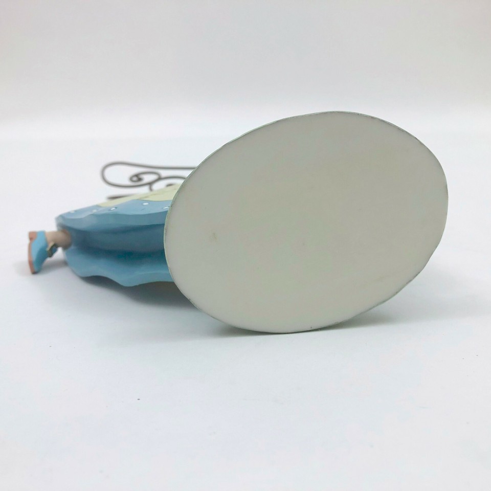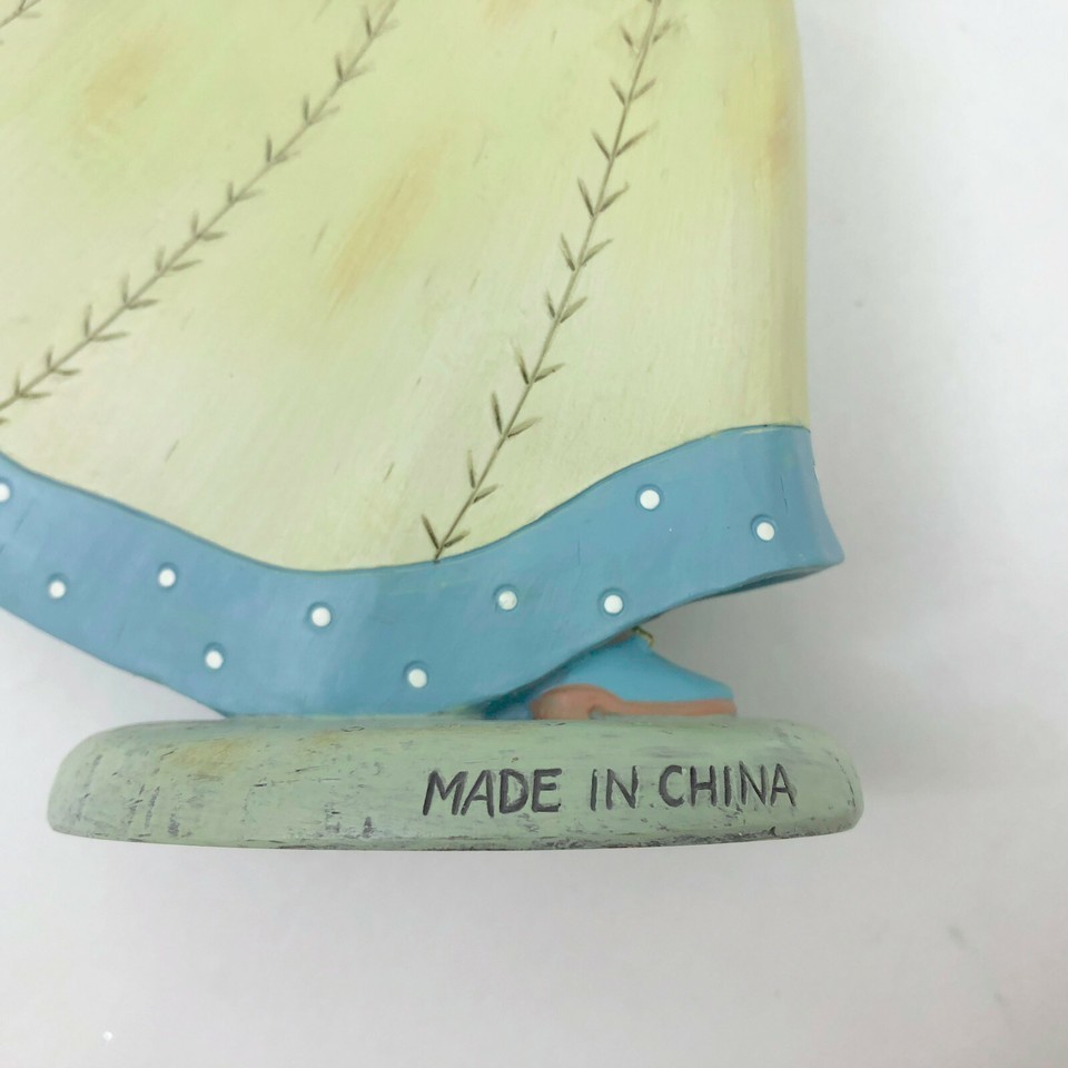 This is a beautiful, sweet angel holding a pink white heart in her hands. Her wings are metal. She has a gold tone band with a pink heart on her blond hair. Her dress is blue at the top with a gold tone belt; and the cream skirt has a blue hem with white polka dots. There is an abstract pattern on the skirt. Her shoes are blue with a gold tone blue buckle. She stands on a distressed look sage base.