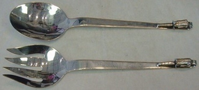Sterling silver TWO PIECE SALAD SERVING SET WITH 3-D FLOWER ON HANDLE 10 1/2" in the pattern Blossom by GPR. It is not monogrammed and is in excellent condition.