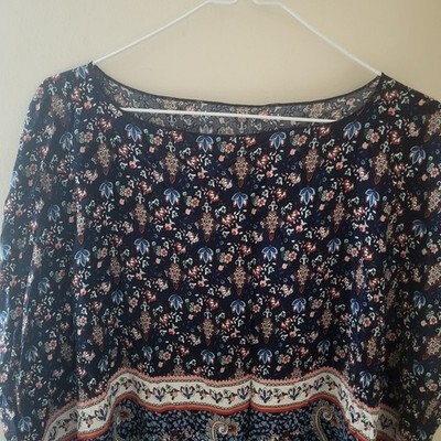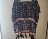 This colorful blouse is still in good condition. It has tassels on the bottom for design. There is no brand or size tag. Has openings on the sides with a couple buttons. Pit to pit measures up to 27".