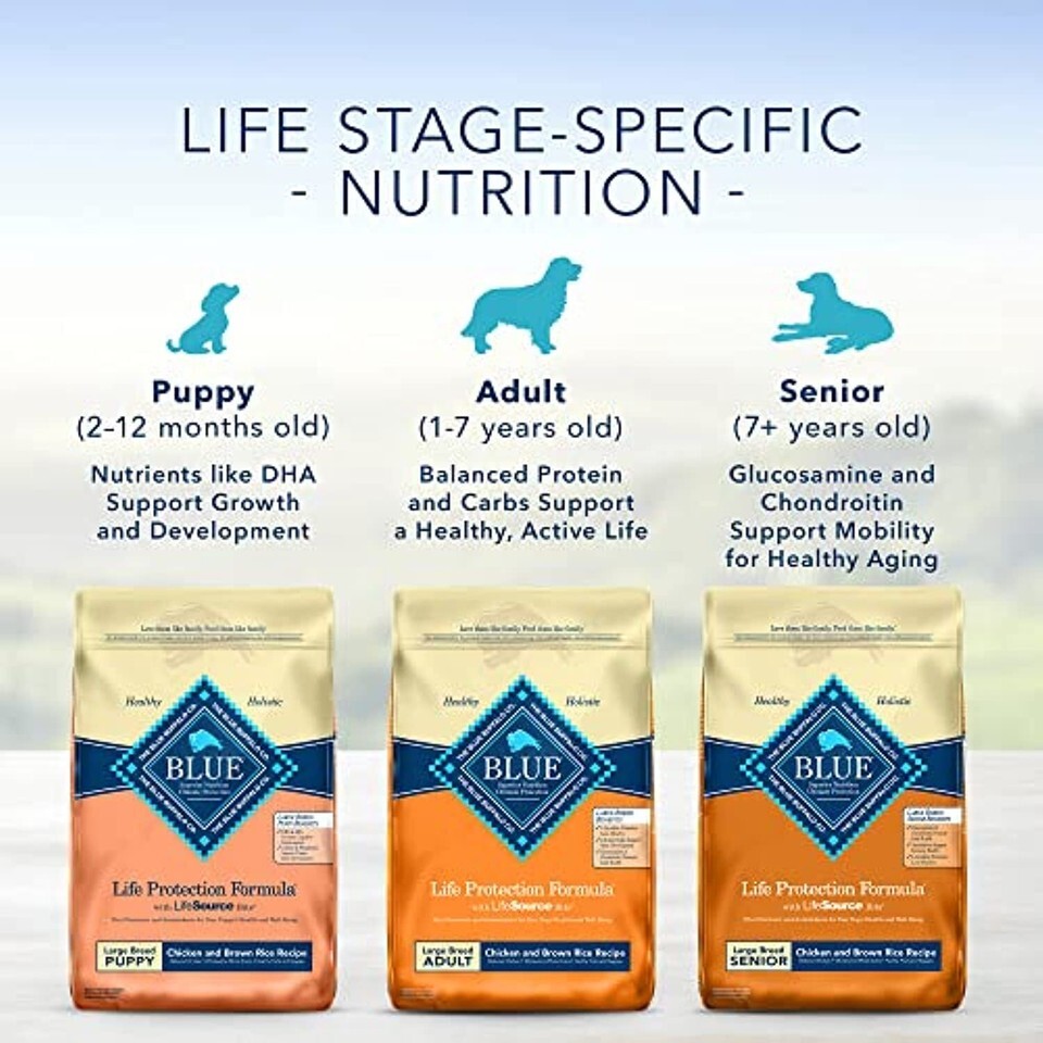 LARGE BREED DOG FOOD: Specially formulated for the wellness of adult large breed dogs, BLUE Life Protection Formula Large Breed dry dog food contains glucosamine and chondroitin to help support joint health and overall mobility of bigger dogs