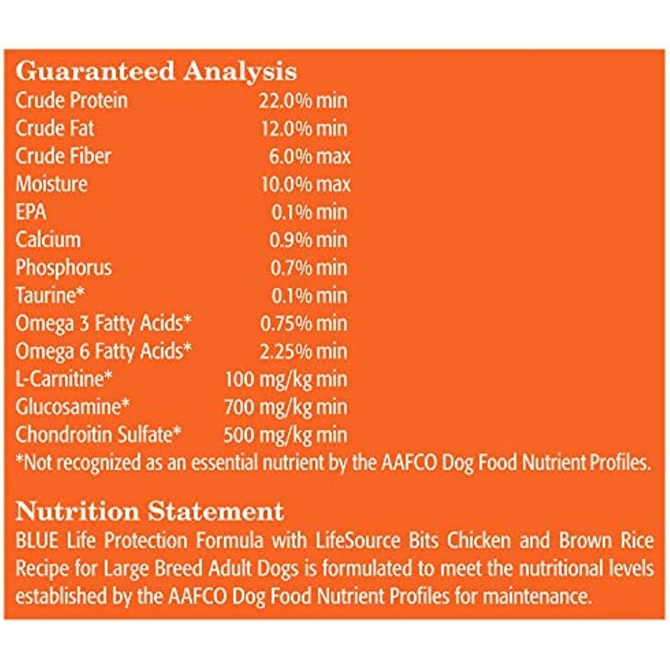Contains one (1) 30 lb. Bag of BLUE Life Protection Formula Large Breed Adult Dry Dog Food, Chicken and Brown Rice