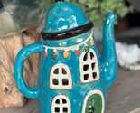 A lovely Teapot ceramic tea light holder featuring a green front door, arched windows and multi coloured lights.