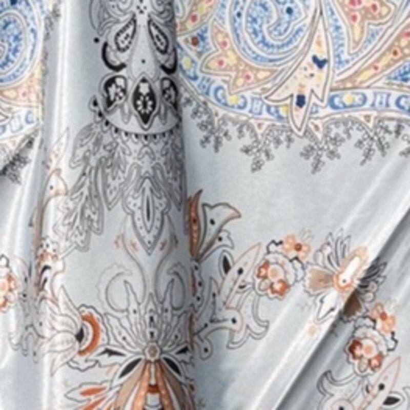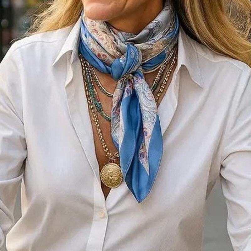 Classic wild rag/scarf in blue with a decorative floral pattern. It is a square and measures 35" x 35". It is sure to add a bright pop of color to any outfit. 100% machine washable polyester, silky and soft.