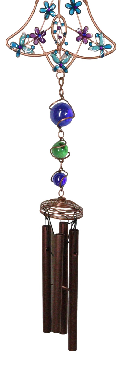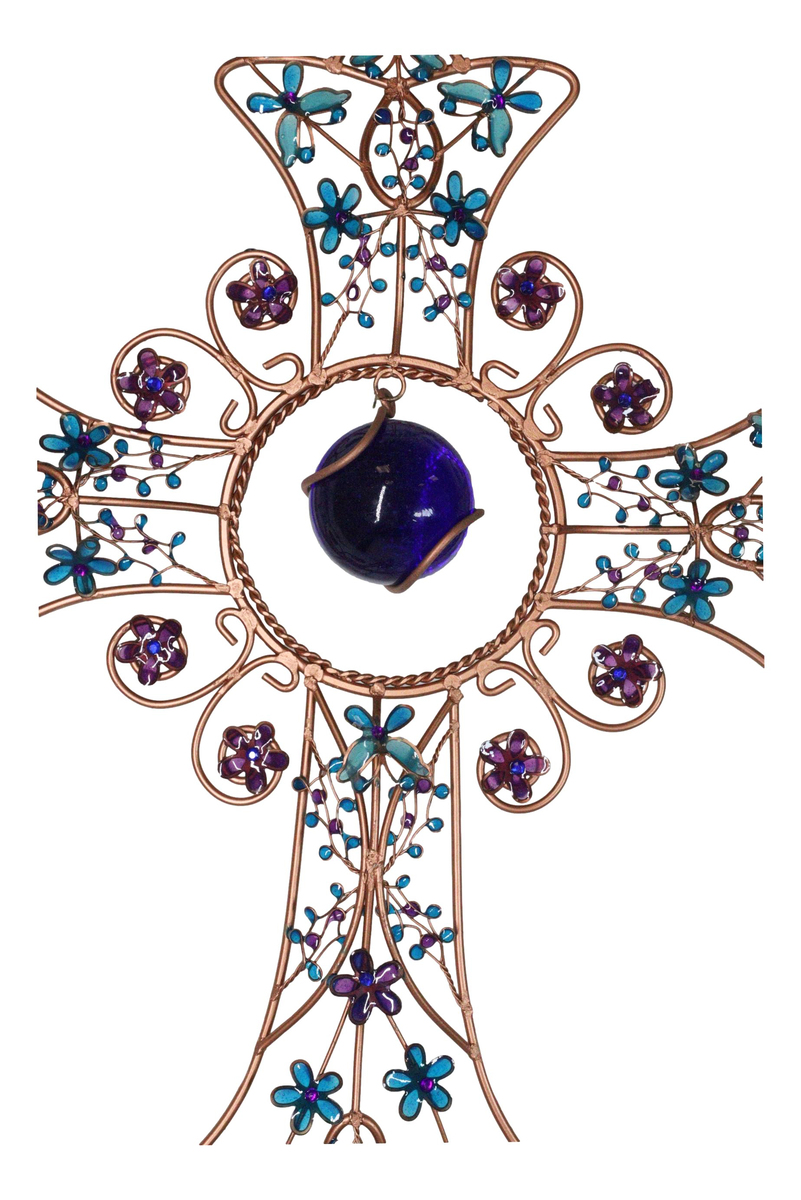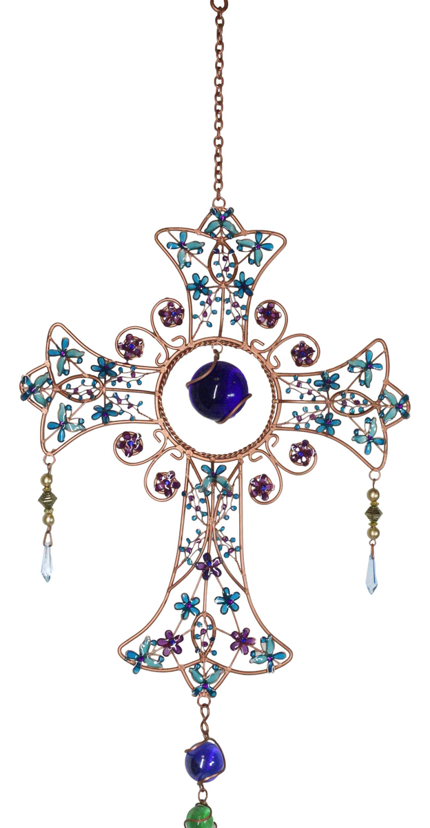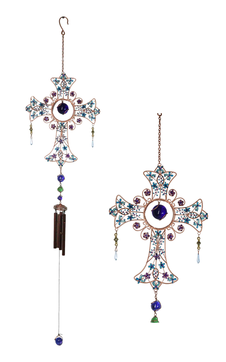 ? This Beautiful Floral Cross Wind Chime is made of Copper and Faux Gemstones/crystals, hand painted and polished individually. Color Tone May Vary from pictures.