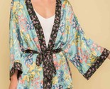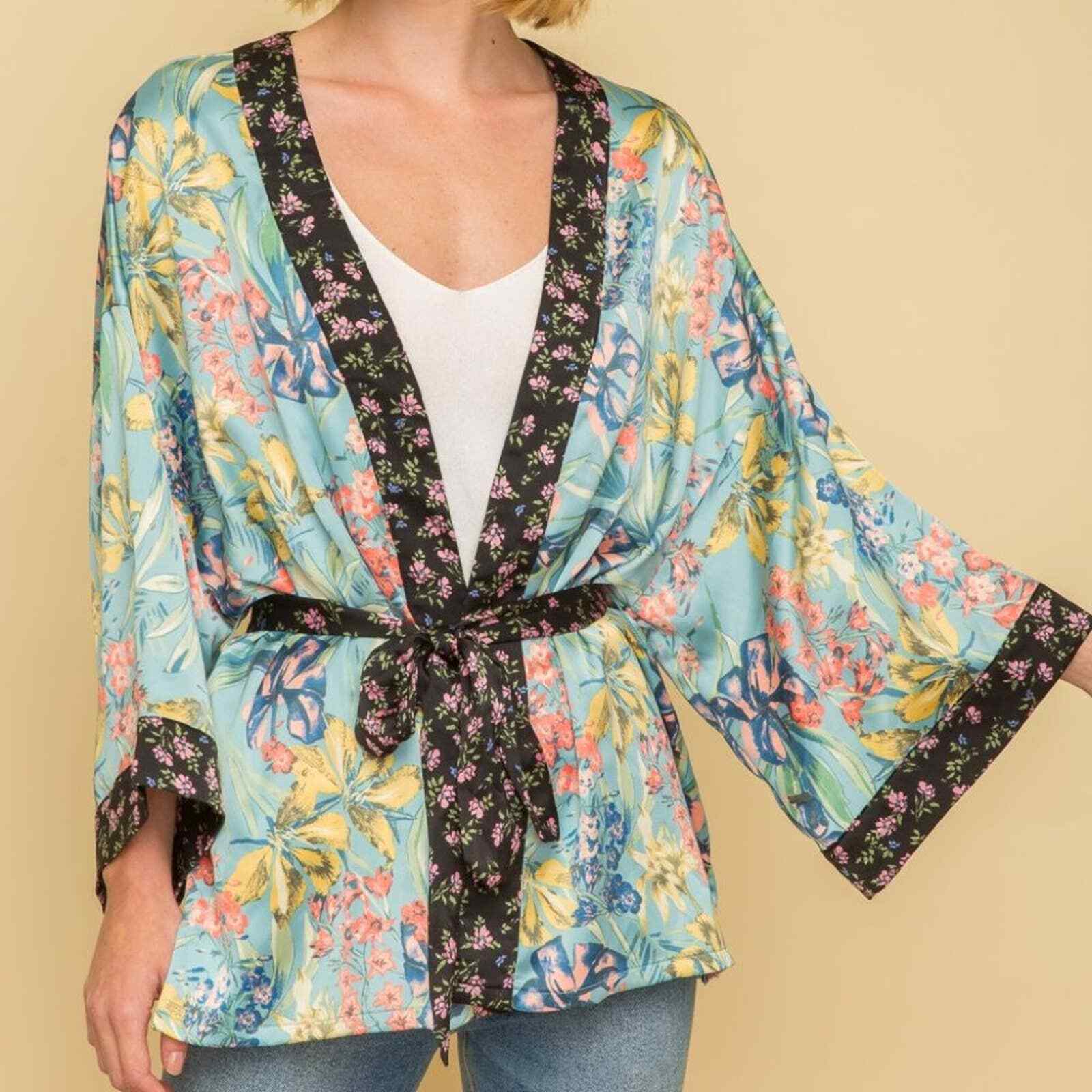 Blue/Green Floral Tie Kimono w Black Floral Trim S/M