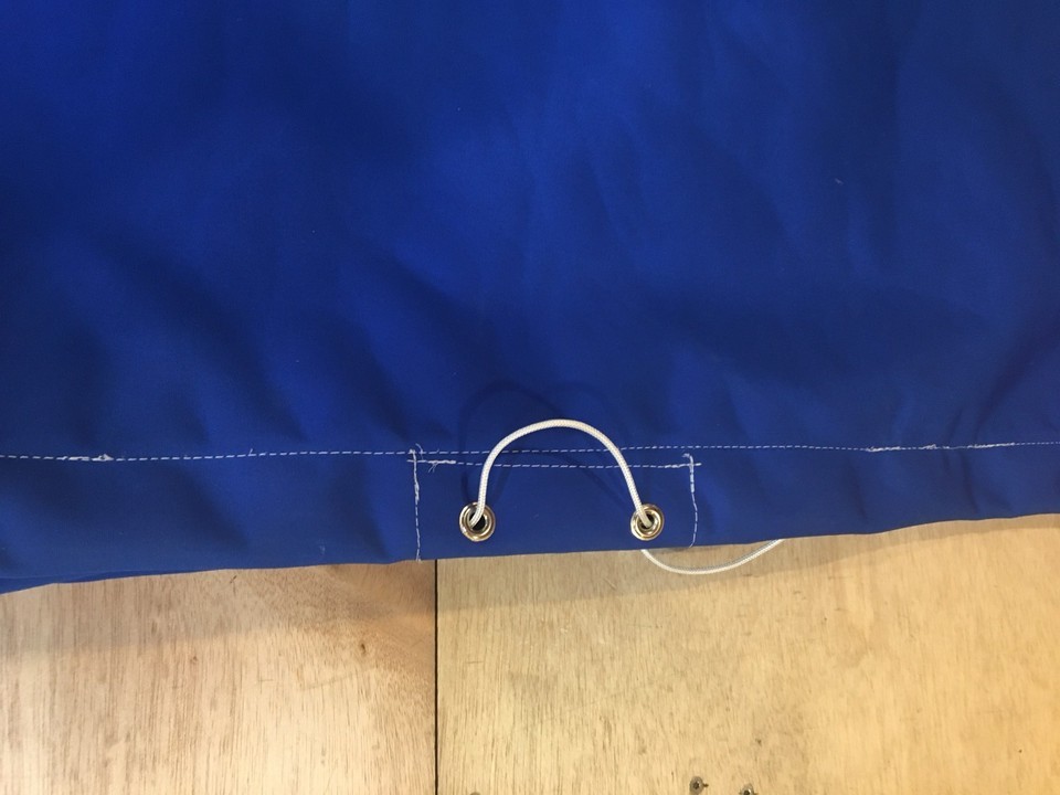 The bag measures approximately 18 x 36 inches with side and bottom handles to help with handling and securing the bag. The closure on the bag is a double drawstring and I have added a Sunbrella flap that closes the mouth of the bag to the elements when the drawstring is cinched down. As with all of my bags the fabric is cut with a hot knife to seal the edges and minimize unraveling. All seams are double sewn for security and durability.