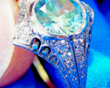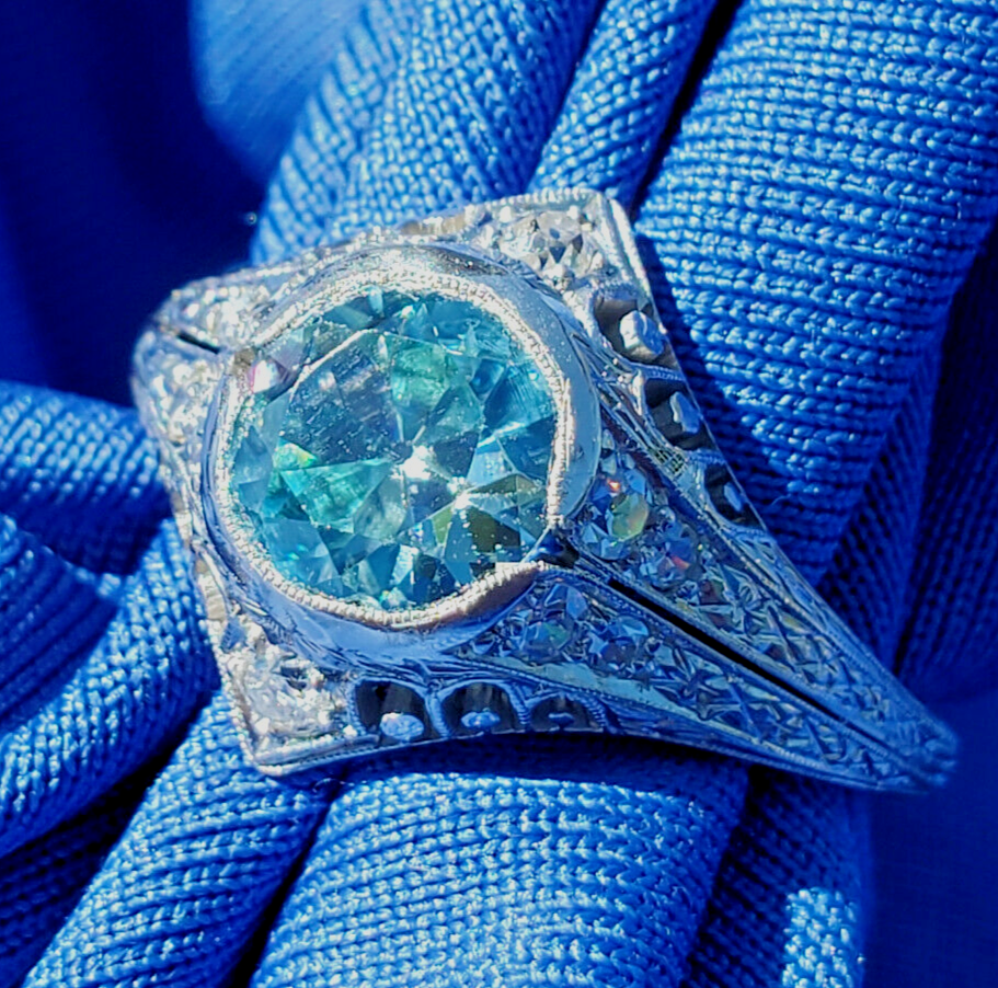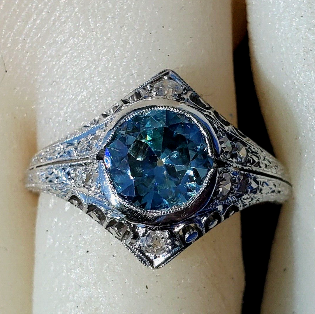 - Blue Zircon Diamond Platinum Filigree Deco Engagement Ring Vintage Statement 8.5