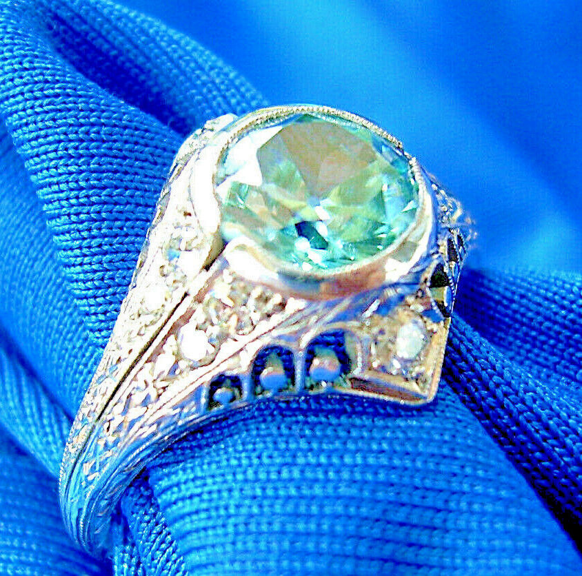 Blue Zircon Diamond Platinum Filigree Deco Engagement Ring Vintage Statement 8.5