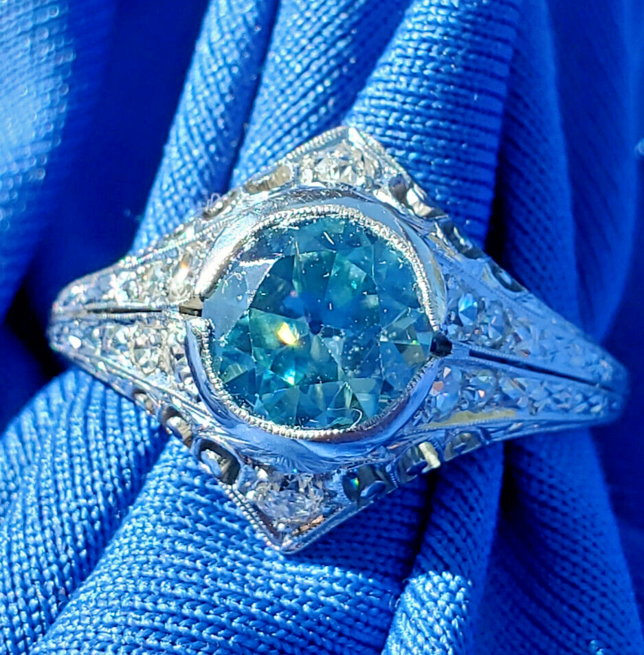 AMAZING NATURAL ZIRCON DIAMOND DECO PLATINUM ENGAGEMENT STATEMENT RING.