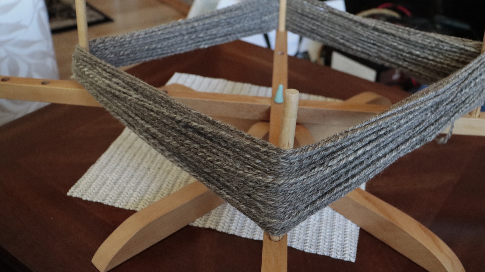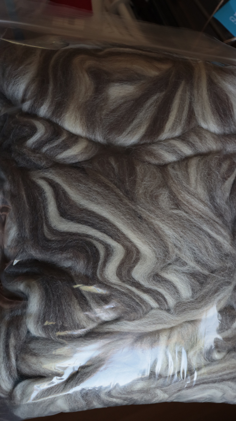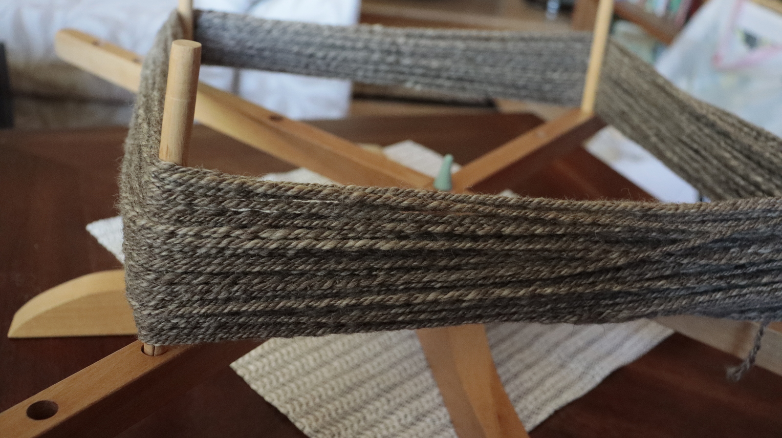 And it's nice to work with, very soft. This particular preparation was marked as Humbug, which seems to mean a blend of gray-brown and white fibers. The resulting yarn is a lovely smooth silver-gray with flecks of white; although it doesn’t actually shimmer, it looks like it ought to.