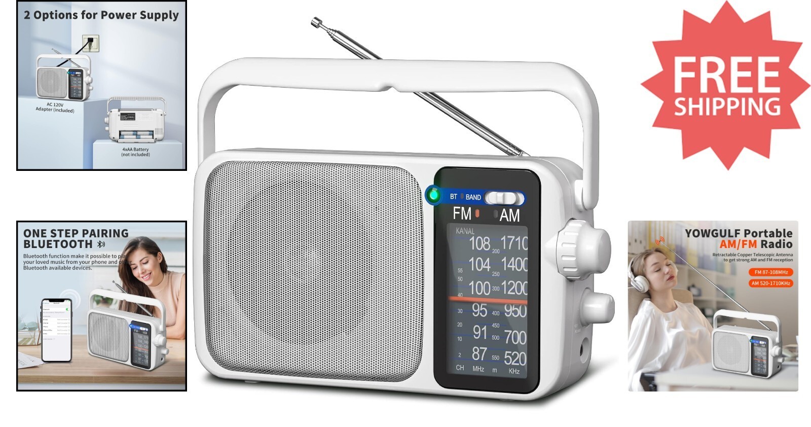 Experience versatile listening with the YOWGULF Portable AM/FM Radio, featuring a sleek handheld design and a retractable copper telescopic antenna for crystal-clear AM and FM reception (FM 87-108MHz, AM 520-1710KHz). Easily tune into your favorite stations with large knobs and visible labels, enjoying clear sound quality from its big loudspeaker ? perfect for music, news, sports, or NPR. The radio includes a headphone jack for private listening and offers Bluetooth connectivity to stream your favorite music wirelessly from your devices. With dual power options?AC plug-in or 4 AA batteries (not included)?it?s reliable during power outages or outdoor activities. Compact and portable with a convenient handle, it?s ideal for home use, outdoor adventures, emergencies, or as a thoughtful gift. Enhance your daily life with a reliable, easy-to-use radio that keeps you connected wherever you go.