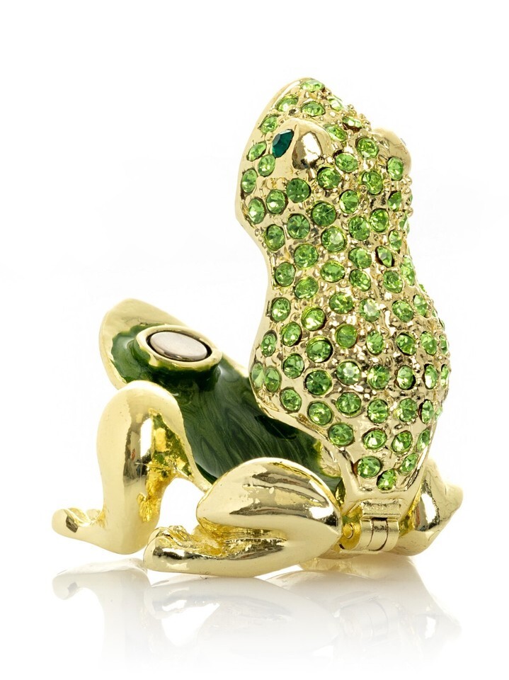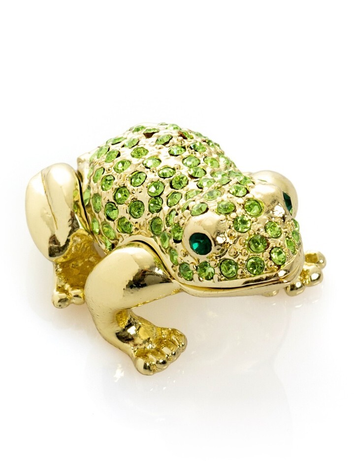 La boîte a bibelots grenouille assise fabriquee a la main Keren Kopal est une charmante piece decorative adaptee a toutes les occasions. Cette boîte a bibelots unique a la forme d'une grenouille et est decoree de cristaux autrichiens, ajoutant une touche de style art nouveau a n'importe quelle piece. Fait a la main en Israel, cette boîte plaquee or dispose d'une fermeture magnetique et d'instructions d'entretien faciles. La couleur verte frappante et le design complexe en font un cadeau parfait pour les adolescents, les garcons, les adultes et les enfants qui apprecient les objets de collection avec une touche fantaisiste.
