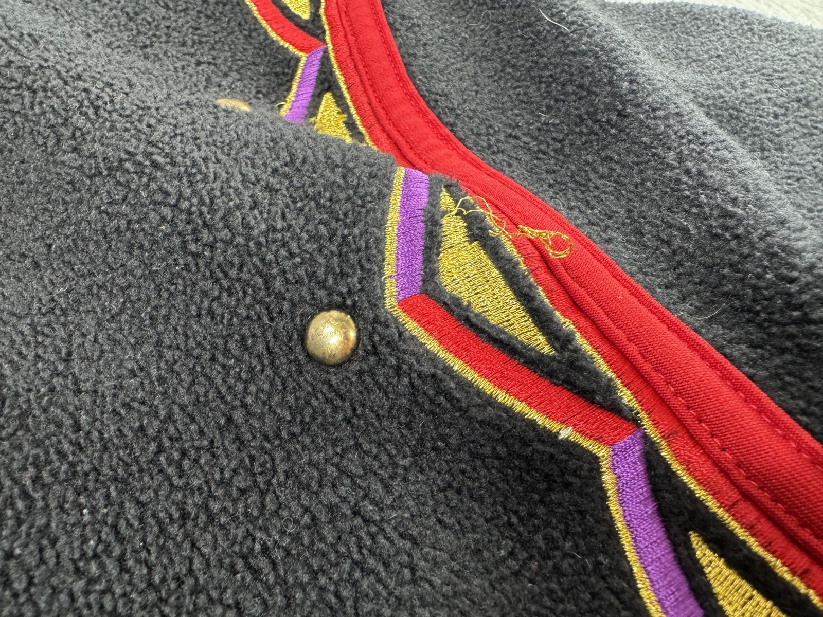 Design: Multicolor embroidered geometric panels at shoulders with gold-tone stud accents