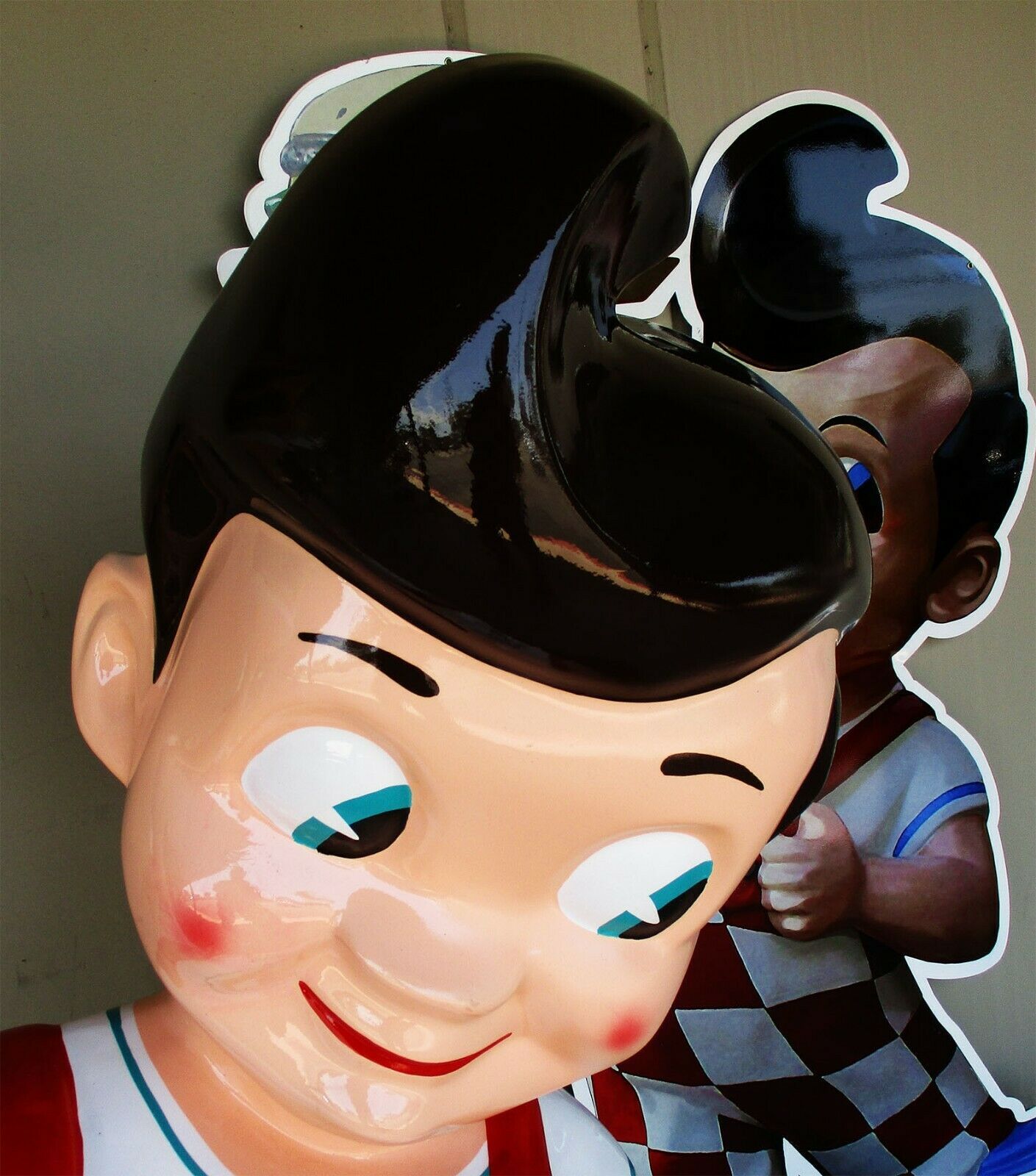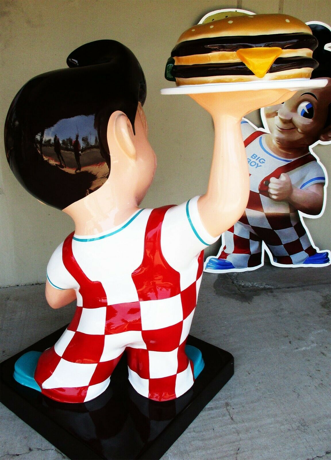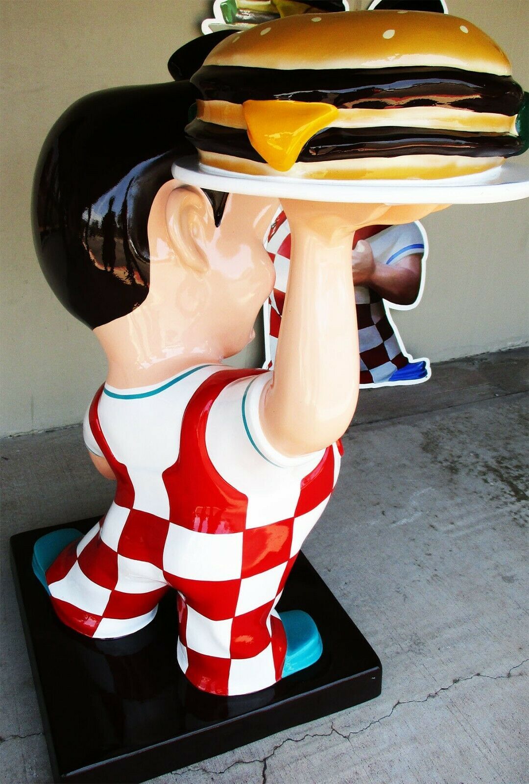 This is a Bob's Big Boy fiberglass statue stands 55" tall by 45" wide on a 28" square base. The figure has been repainted to its original color scheme. Its original use at the Bob's Big Boy restaurants was as an indoor form of advertisement. I'm sure many of you have good memories of seeing the figure when driving by or perhaps even stealing the figure as it often happened. This size figure was usually seen out front by the doors or occasionally inside.