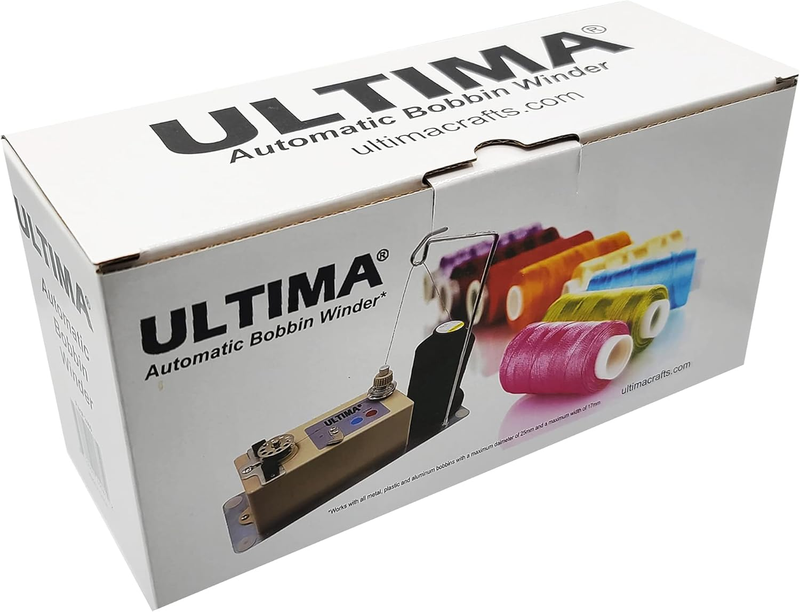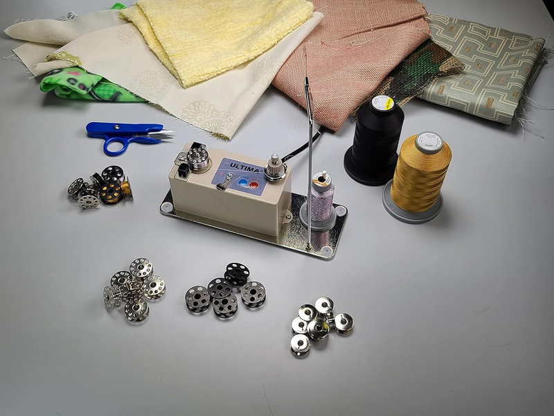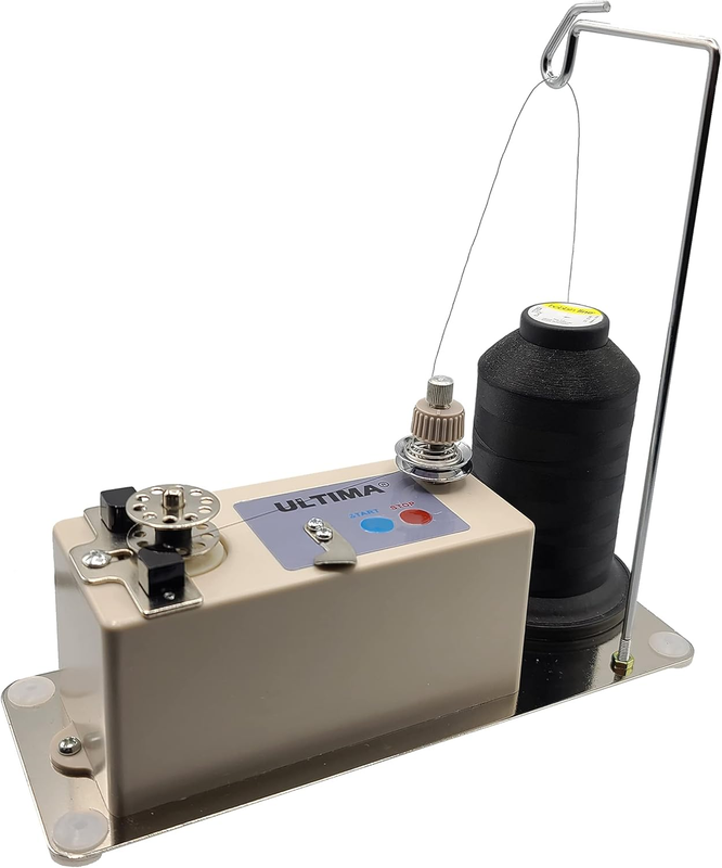 The Ultima 110-volt automatic bobbin winder is a high-speed winding machine that works with all non-proprietary bobbins and all brands of domestic and industrial sewing machines.