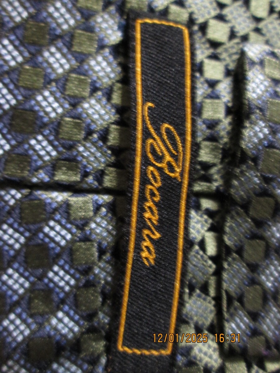 The Bocara Men's Blue Black Long Geometric 100% Silk Handmade Tie is a stylish and unique accessory for men. Made from high-quality silk, this tie features a geometric pattern and a classic pointed style. Handmade in China, this vintage piece is adjustable and one size fits all. The multicolor design adds a touch of sophistication to any formal or professional outfit, making it a versatile and timeless addition to any man's wardrobe. If you have any questions, please content me. Thank you and GOD BLESS.