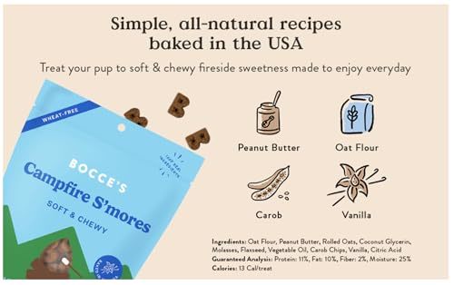 Product description: Share a S?more with your pup! Bocce?s S?mores flavored dog treats are a sweet treat your dog will love. The perfect soft treats for a night by the campfire or snuggling inside. These chewy snacks are made with a wheat-free recipe and 100% real food. Ingredients: Oat Flour, Peanut Butter, Rolled Oats, Coconut Glycerin, Molasses, Flaxseed, Vegetable Oil, Carob Chips, Vanilla, Citric Acid Bocce?s Bakery started in a tiny West Village kitchen with a mixer, an oven, and a scruffy mutt named Bocce with the belief that dogs deserve better. Better treats with fresher, simpler, all-natural ingredients.