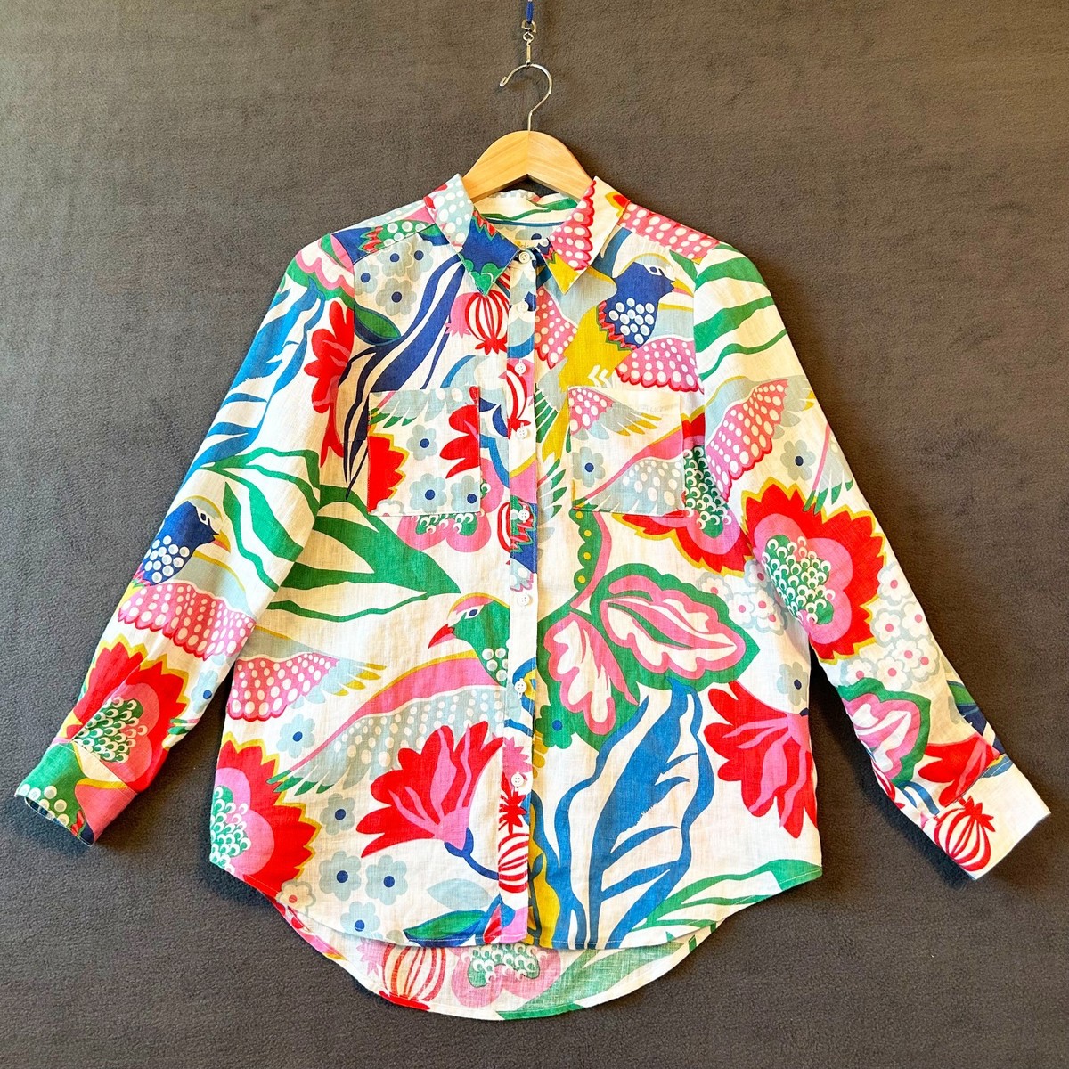 Vibrant and cheerful Boden women?s linen blouse in size 2, featuring a bold allover floral and bird print in shades of red, blue, green, yellow, and pink on a white background. Crafted from lightweight woven linen with a relaxed fit?tropical print is perfect for spring, summer and resort wear.