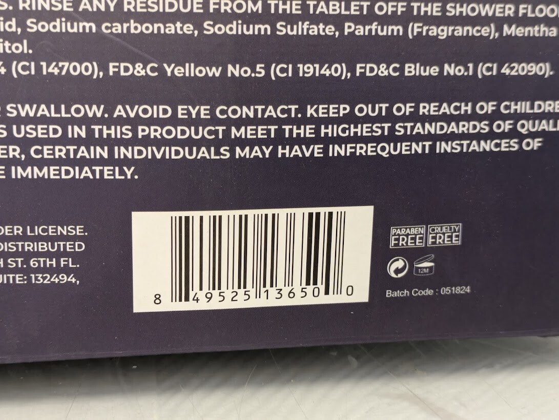 USE CAUTION WHEN EXITING THE SHOWER OR BATHTUB AS INGREDIENTS MAY CAUSE AREAS TO BECOME SLIPPERY. DISCONTINUE IF IRRITATION OR DISCOMFORT OCCURS. RINSE ANY RESIDUE FROM THE TABLET OFF THE SHOWER FLOOR IF NEEDED. INGREDIENTS: Sodium Bicarbonate, Citric Acid, Sodium carbonate, Sodium Sulfate, Parfum (Fragrance), Mentha Piperita